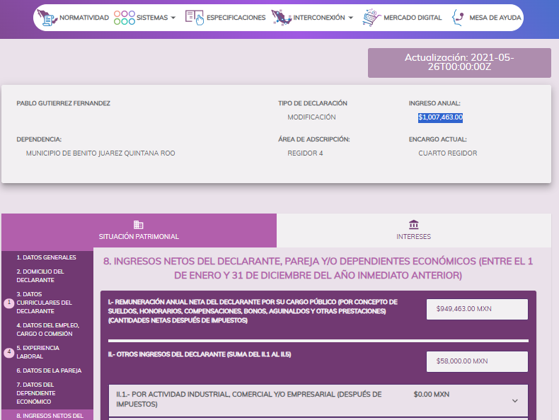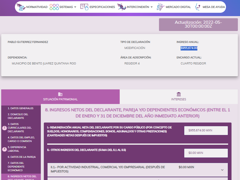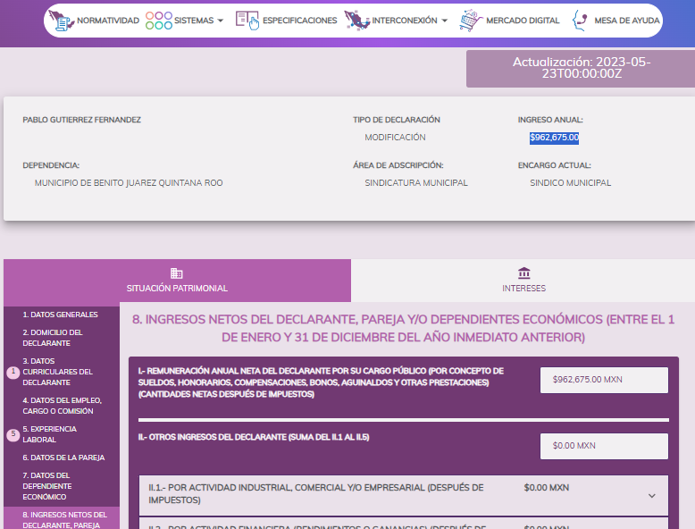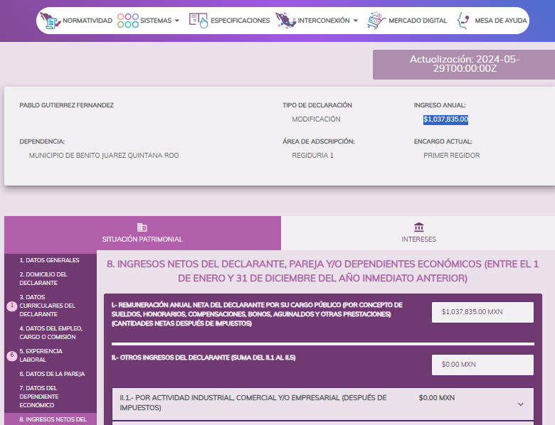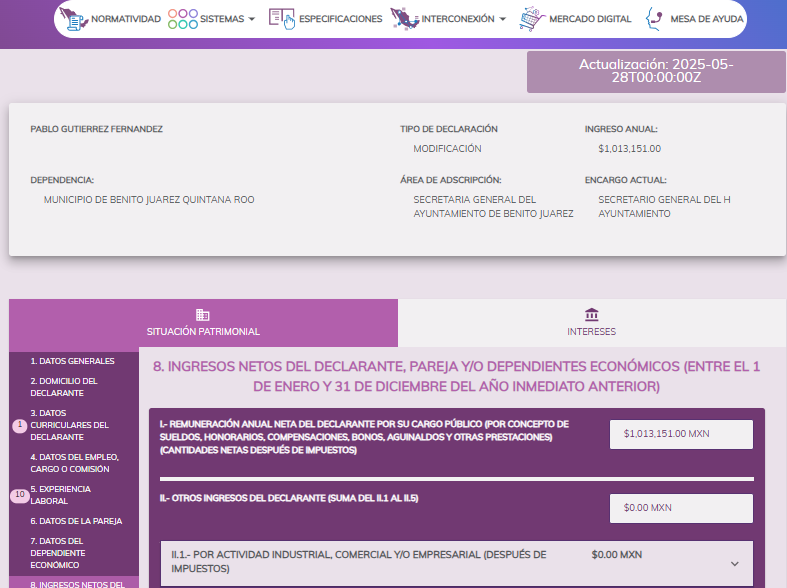 Pablo Gutiérrez como servidor publico del ayuntamiento de Benito Juárez ya obtuvo ganancias por mas de $7 MILLONES DE PESOS en tan poco años, para que un servidor publico del ayuntamiento gane esos $7 millones de pesos debe trabajar 100 años sin gastar un solo peso.