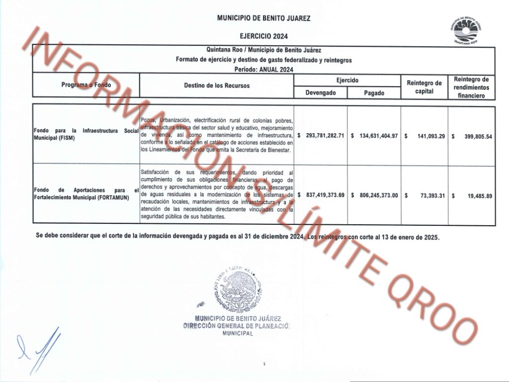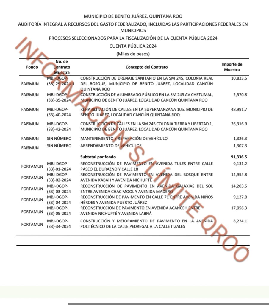 En 2024 la alcaldesa morenista Ana Paty Peralta del Fondo de Aportaciones para la Infraestructura Social Municipal (FAISMUN) recibió $293 millones 781 mil 282 pesos pero colmenares solo le audito $91 millones 336 mil 500 pesos y del Fondo de Aportaciones para el Fortalecimiento de los Municipios y de las Demarcaciones Territoriales del Distrito Federal (FORTAMUN) recibió los cancunenses $837 millones 419 mil 373 pesos de los cuales solo se audito $72 millones 696 mil 900 pesos.