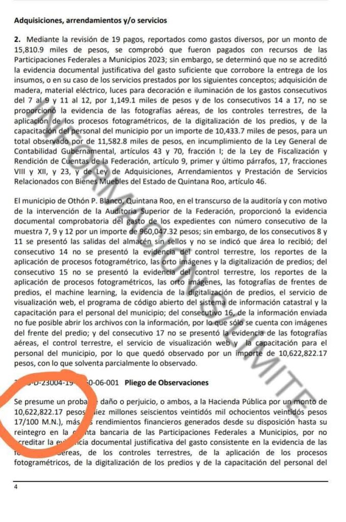 En otro auditoria federal la ASF dictaminó un probable daño o perjuicio, o ambos, a la Hacienda Pública por un monto de 10,622,822.17 pesos (diez millones seiscientos veintidós mil ochocientos veintidós pesos 17/100 M.N.), más los rendimientos financieros generados desde su disposición hasta su reintegro en la cuenta bancaria de las Participaciones Federales a Municipios, por no acreditar la evidencia documental justificativa del gasto consistente en la evidencia de las fotografias aéreas, de los controles terrestres, de la aplicación de los procesos fotogramétricos, de la digitalización de los predios y de la capacitación del personal del municipio, en incumplimiento de la Ley General de Contabilidad Gubernamental, artículos 43 y 70, fracción I, y de la Ley de Fiscalización y Rendición de Cuentas de la Federación, artículos 9, primer y último párrafos, 17, fracciones VIII y XII, y párrafo 23, y de la Ley de Adquisiciones, Arrendamientos y Prestación de Servicios Relacionados con Bienes Muebles del Estado de Quintana Roo, artículo 46.