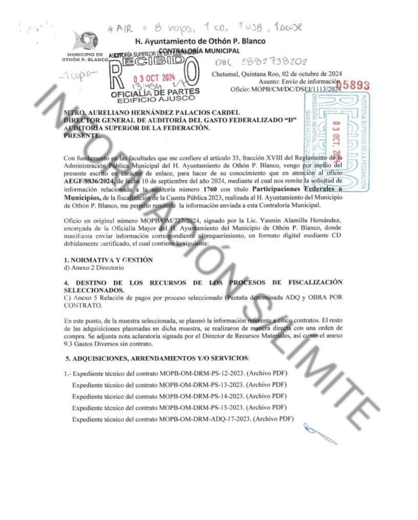 La Auditoria Superior de la Federación promueve la Promoción de Responsabilidad Administrativa Sancionatoria para que el Órgano Interno de Control del Municipio de Othón P. Blanco, Quintana Roo o su equivalente realice las investigaciones pertinentes y, en su caso, inicie el procedimiento administrativo correspondiente por las presuntas irregularidades de las personas servidoras públicas que, en su gestión, no realizaron la investigación de mercado, no consideraron las adquisiciones en el Programa Anual de Adquisiciones, Arrendamientos y Servicios del municipio, no integraron las propuestas técnicas y económicas de los proveedores adjudicados, la última declaración anual del impuesto sobre la renta, las actas de junta de aclaraciones, presentación y apertura de propuestas, el dictamen de evaluación técnica y económica y el fallo no se formalizaron por la mitad más uno de los integrantes del comité de adquisiciones de los contratos números MOPB-OM-DRM-ADQ-14-, МОРВ-OM-DRM-ADQ-15, MOPB-OM-DRM-ADQ-16 у MOPB-OM-DRM-ADQ-18-; del contrato número MOPB-OM-DRM-ADQ-16- no se contó con la constancia de situación fiscal y el acta de nacimiento del proveedor adjudicado, y del contrato número MOPB-OM-DRM-ADQ-18- el proveedor adjudicado no se encontró dentro del padrón de proveedores vigente, ni se proporcionó el acta constitutiva de la empresa adjudicada, la constancia de situación fiscal, ni el dictamen de evaluación técnica y económica, en incumplimiento del Reglamento de Adquisiciones, Contratación de Bienes, Prestación de Servicios y Arrendamientos para el Municipio de Othón P. Blanco, Quintana Roo, artículos 16, fracción VI, 27, 37, 47, fracción II, y 62.