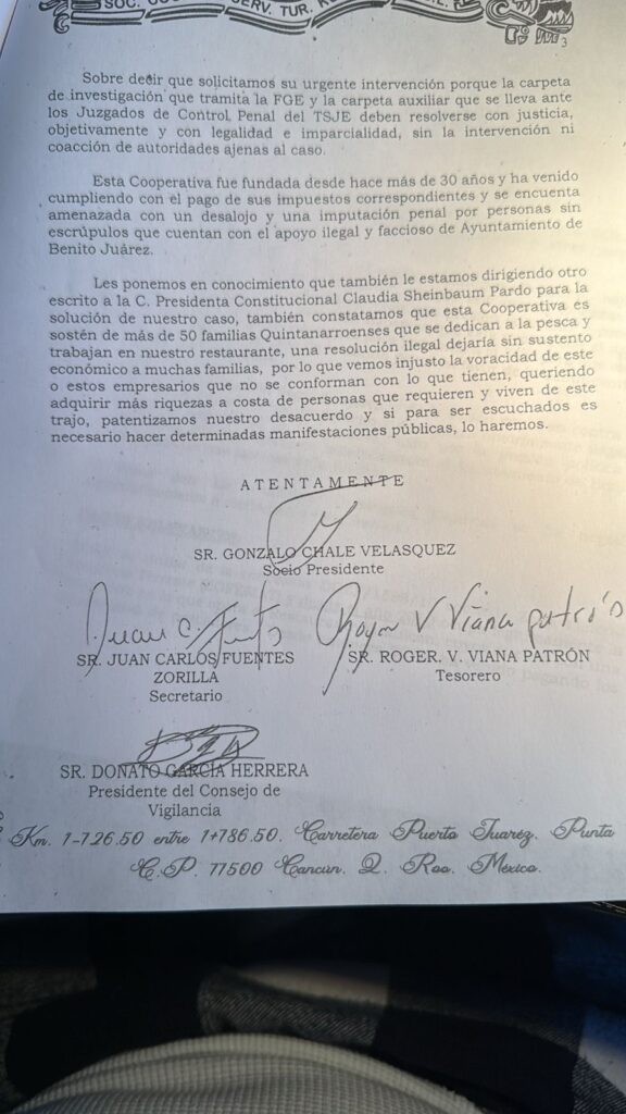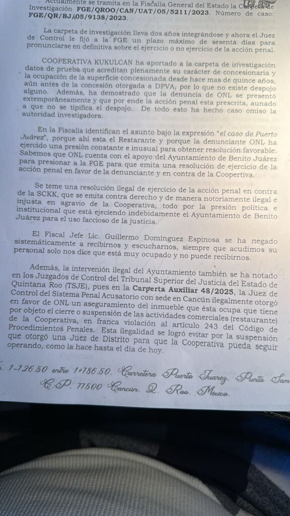 “Sabemos que ONL cuenta con el apoyo del Ayuntamiento de Benito Juárez para presionar a la FGE para que emita una resolución de ejercicio de la acción penal en favor de la denunciante y en contra de la cooperativa”, se lee en la carta que fue enviada a la gobernadora.