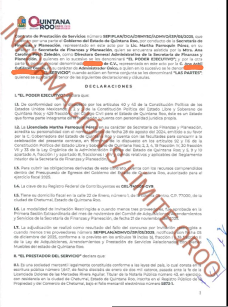 A través de Martha Parroquín se le entrego dos contratos de obras publicas por adjudicación directa a la hermana de la diputada Diana Gutiérrez Ana Ashli Gutiérrez, para que Rehabilite los Módulos Sanitarios del Palacio de Gobierno Estatal, en la localidad de Chetumal, en el Municipio de Othón P. Blanco de Quintana Roo.