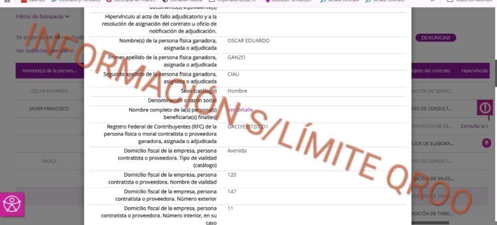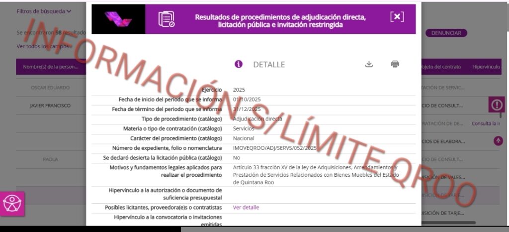 Por adjudicación directa violando el Artículo 33 fracción XV de la ley de Adquisiciones, Arrendamientos y Prestación de Servicios Relacionados con Bienes Muebles del Estado de Quintana Roo LA IMOVEQRO le entrego al Jefe del área de imagen y diseño de Comunicación Social del ayuntamiento de Cozumel Oscar Eduardo Ganzo Ciau el contrato IMOVEQROO/ADJ/SERVS/052/2025 para la PRESTACIÓN DE SERVICIOS PARA EL DISEÑO GRÁFICO DE REDES SOCIALES DEL IMOVEQROO comprometiéndose a pagar mensual $77645 pesos durante todo el ejercicio fiscal 20/25.
