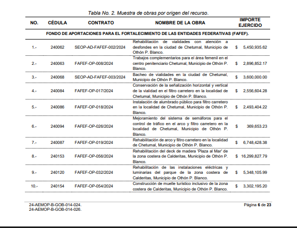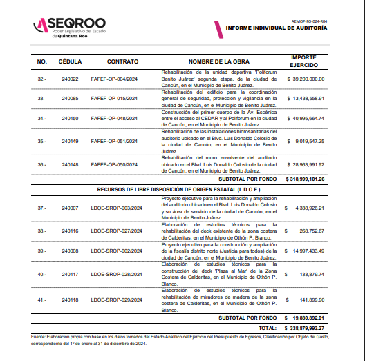 La ASEQROO por ordenes de Miguel Cheluja, en la cuenta publica 2024 realizada a la Secretaria de Obras Publicas del Gobierno de Quintana Roo solo le audito en sus egresos (gastos) $154 millones 105 mil 222.04 pesos de los $626 millones 748 mil 418.04 que se gastó.