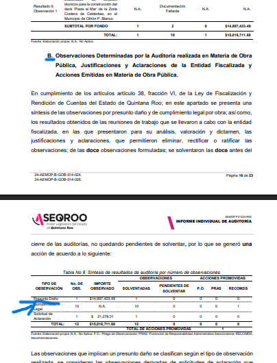 De los $338 millones 879 mil 993.27 peso que le auditaron a la SEOP con el numero de oficio ASEQROO/ASE/AEMOP /1292/08/2025 se detectaron irregularidades en la integración de la documentación soporte de éstos, originando observaciones de presunto daño, cumplimento legal y solicitud de aclaración en materia en materia de obra pública que en un abrir y cerrar de ojos fueron encubiertos y maquillados.