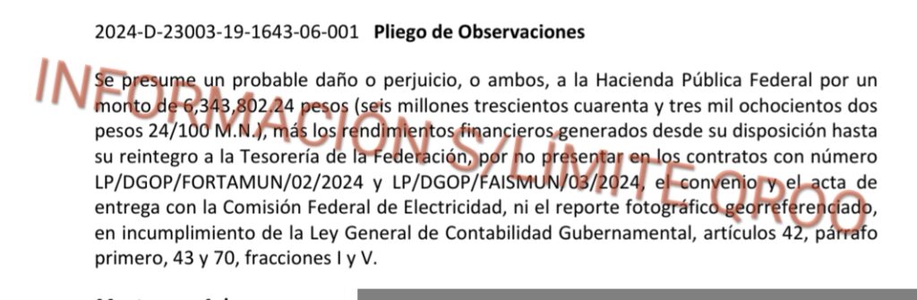 comprobatoria y justificativa del gasto, en incumplimiento a la Ley General de Contabilidad Gubernamental en los artículos 42, párrafo primero, 43 y 70, fracciones I y V. El Municipio de Isla Mujeres, Quintana Roo, en el transcurso de la auditoría y con motivo de la intervención de la Auditoría Superior de la Federación, proporcionó la documentación consistente en la estimación con documentación soporte, póliza de egresos, convenios modificatorios y pruebas de laboratorio para la justificación de los contratos núm. LP/DGOP/FAISMUN/01/2024, LP/DGOP/FAISMUN/03/2024 y LP/DGOP/FORTAMUN/02/2024, sin embargo, en los contratos números LP/DGOP/FAISMUN/03/2024 y LP/DGOP/FORTAMUN/02/2024, no presentó el convenio y el acta de entrega con la Comisión Federal de Electricidad, ni el reporte fotográfico georreferenciado, en su desesperación de la alcaldesa tarto de justificar las irregularidades sin embargo la ASF rechazo la documentación emitiendo;
