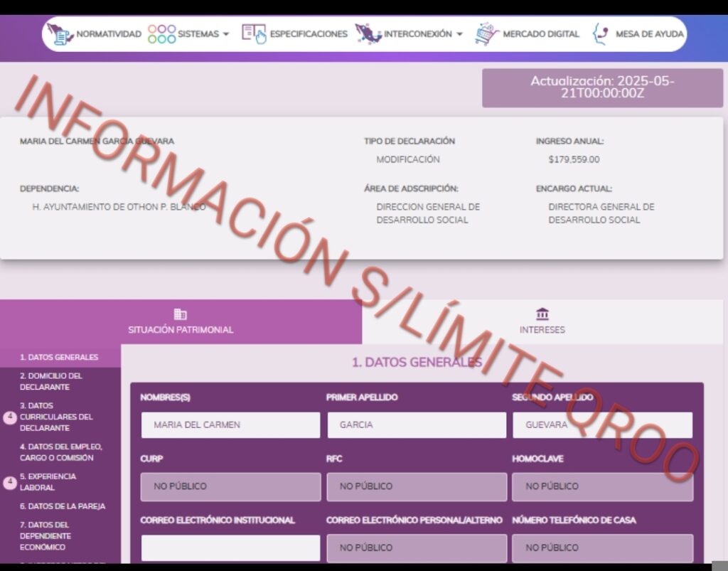 De acuerdo a los documentos en nuestro poder del Sistema de evolución patrimonial, de declaración de intereses y constancia de presentación de declaración fiscal, María del Carmen García desde el 2025 goza de dos puestos, dos salarios, el primero como 5a regidora del H Cabildo de OPB con un salario mensual de $65 mil pesos y como Directora General de Desarrollo Social con un salario mensual de $14,963.25 pesos, ambos cargos los ejerce en el mismo horario.