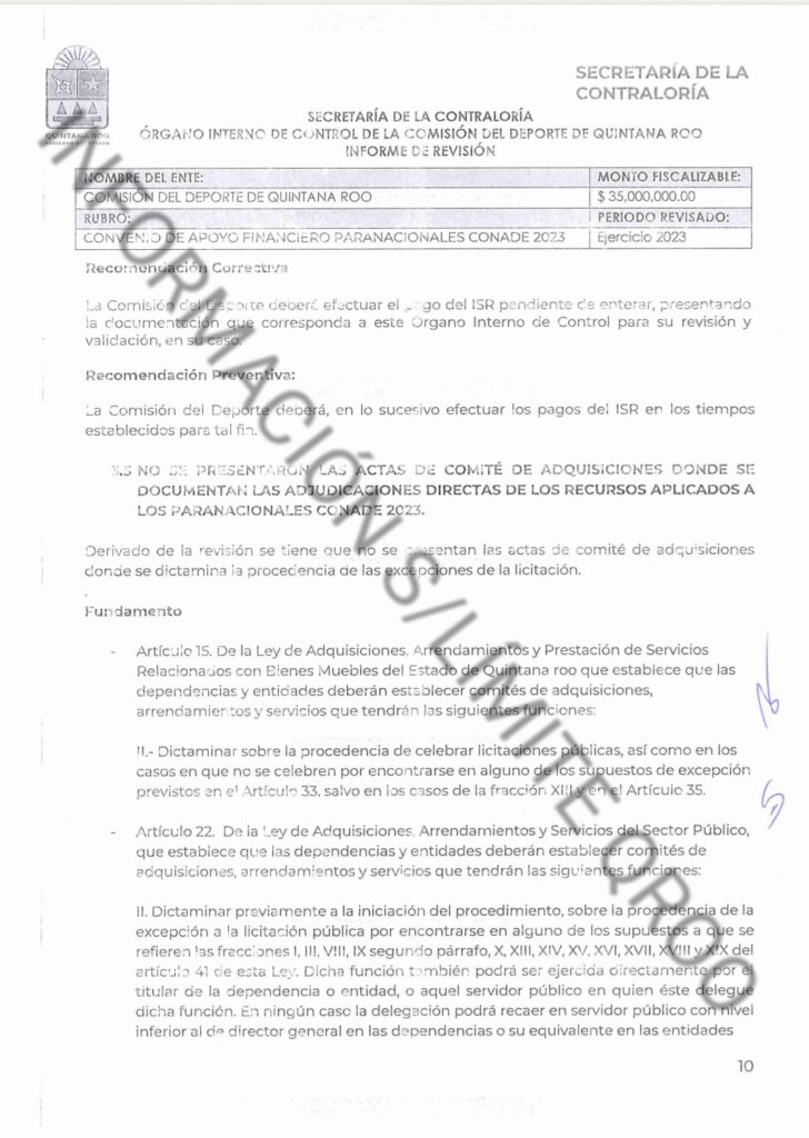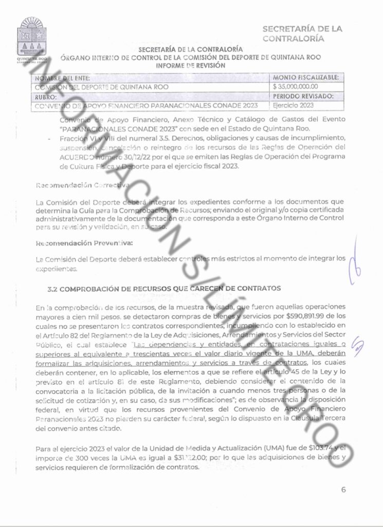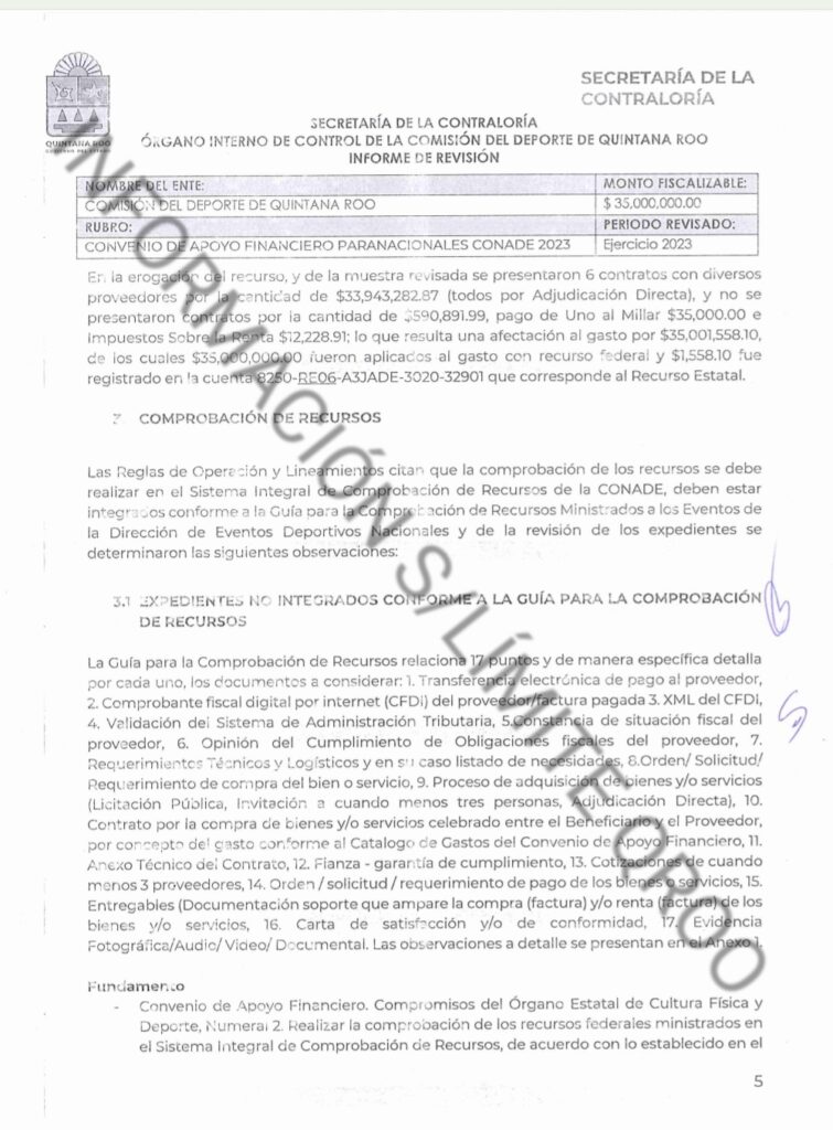 La SABGOB con el oficio número SECOES/SACI/000189/IV/2024, de fecha 19 de abril del 2024, suscrito por la Lic. Diana Trujillo Mondragón, Subsecretaria de Auditoría y Control Interno de la Secretaría de la Contraloría del Estado, dirigido al Lic. Jacobo Adrián Arzate Hop, en su carácter de Encargado del Despacho de la Presidencia de la Comisión del Deporte de Quintana Roo, se notificó la revisión al Convenio de Apoyo Financiero Paranacionales CONADE 2023, identificada con el número RE/OR/017/24, cuyo periodo de revisión es el Ejercicio 2023.