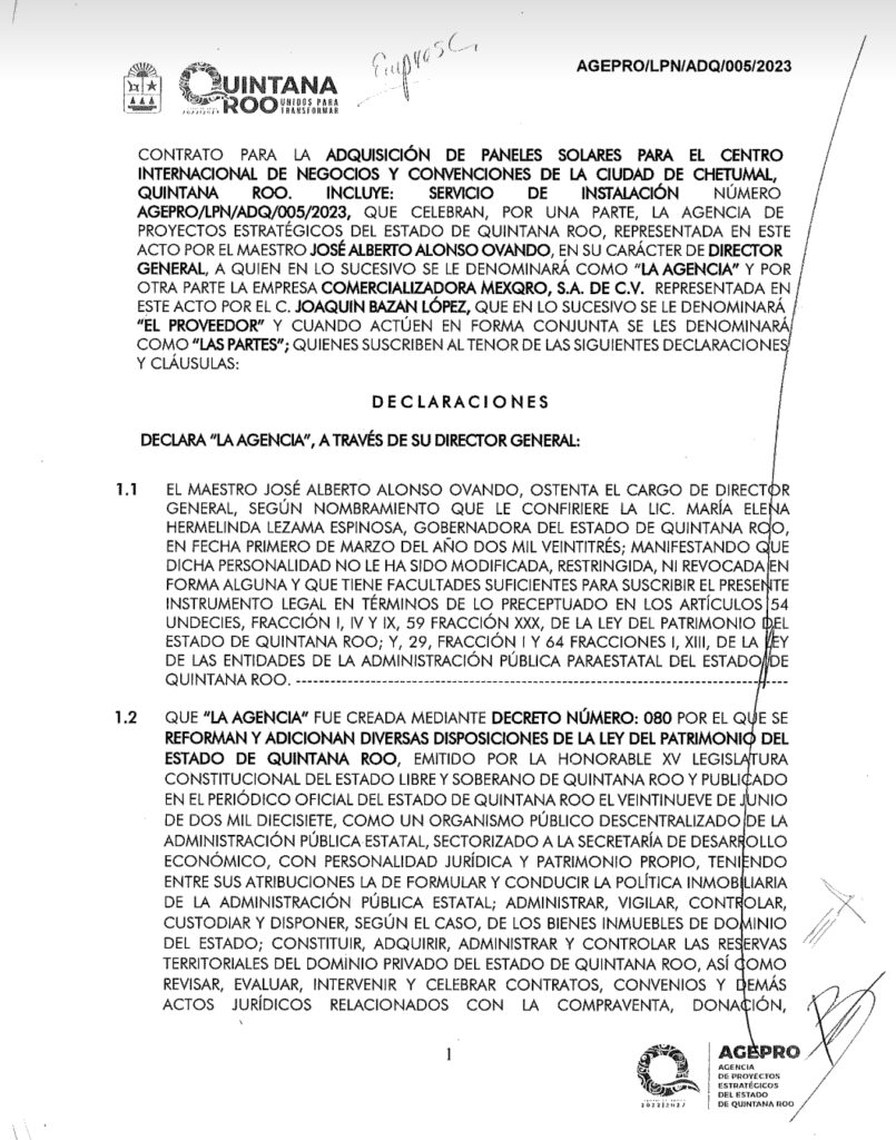 La agencia de proyectos estratégicos de Quintana Roo (AGEPRO) a cargo del priista José Alberto Alonso Ovando de manera irregular también le entrego un contrato de compra por mas de $13 millones de pesos para la adquisición de paneles solares para el centro internacional de negocios y convenciones en la cuidad de Chetumal a pesar de que su giro comercial de la empresa es diferente.