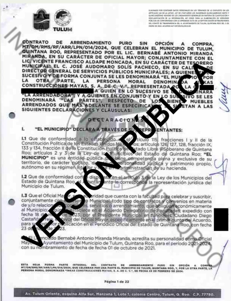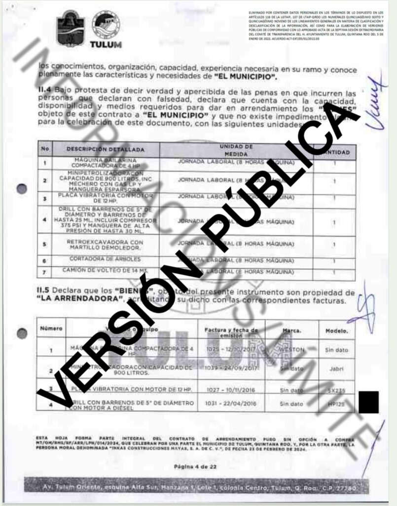 Bajo el numero de contrato MT/OM/RMS/RF/ARR/LPN/014/2024 el ayuntamiento de Tulum le entrego a la empresa yucateca INKAS CONSTRUCCIONES MAYAS S.A de C.V $4 millones 387 mil pesos para el arrendamiento puro sin opción de compra de maquinaria y camiones para la dirección general de servicios públicos municipales de Tulum.