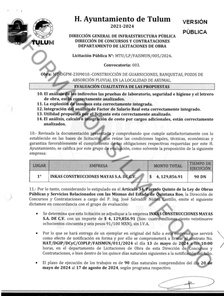 INKAS en el 2024 también recibió del ayuntamiento de Tulum el contrato MT-DGPM-2309010 (MTU/LP/FAISMUN/005/2024). por $4 millones 790 mil 634.02 pesos para la CONSTRUCCIÓN DE GUARNICIONES, BANQUETAS, POZOS DE ABSORCIÓN PLUVIAL EN LA LOCALIDAD DE AKUMAL, sin embargo el contrato fue extraviado ya que por cada pozo de absorción Diego Castañón pago con los impuestos de los tulumnenses mas de $200 mil pesos, un tremendo robo descarado.