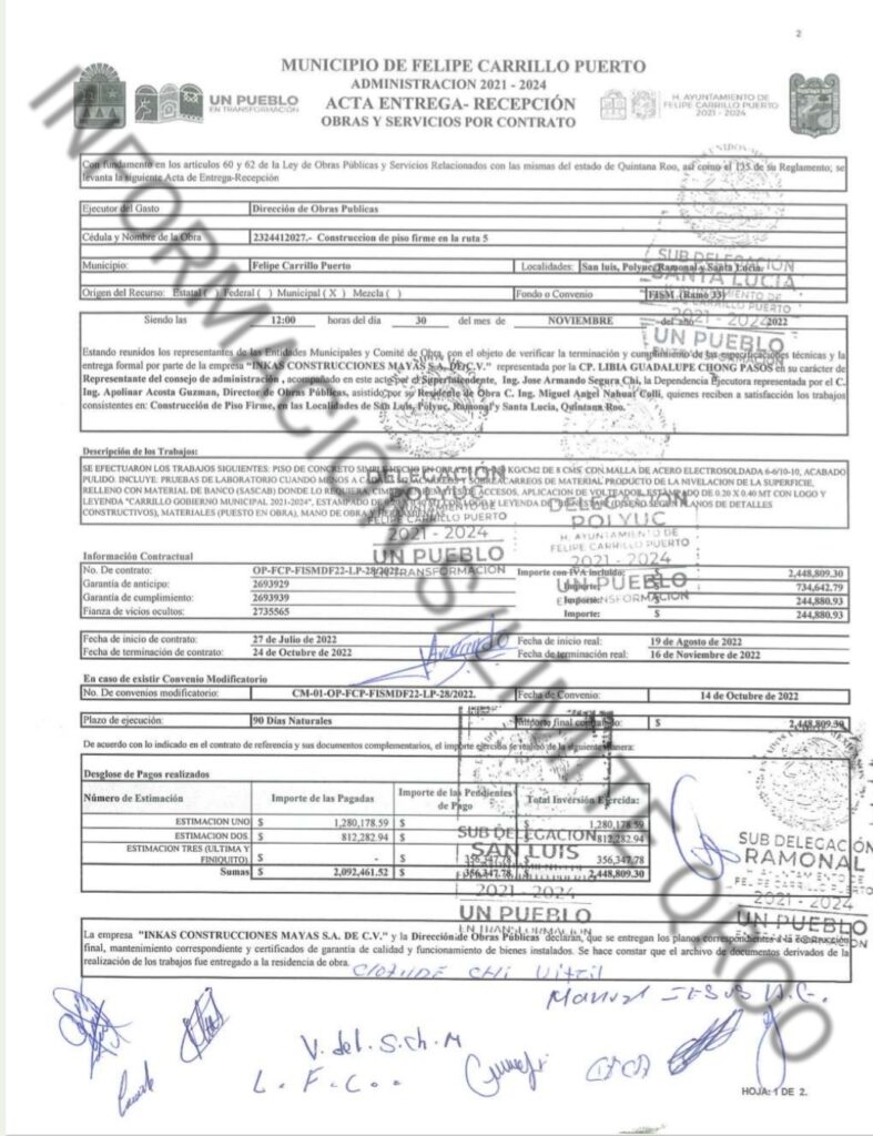 Inkas Construcciones Mayas S.A. de C.V., representada por Libia Guadalupe Chong Pasos en la administración del ex presidente municipal de Felipe Carrillo Puerto José Esquivel Vargas recibió contratos irregulares donde la Auditoria Superior del Estado a cargo de Manuel Palacios Herrera detecto daños a las arcas municipales, sin embargo la alcaldesa morenista Maricarmen Candelaria Hernández Solís en lugar de denunciar estas graves irregularidades la premio con contratos de obras publicas, como por mencionar la obra marcada con el numero 2324412027.- por $2 millones 448 mil 809.30 pesos para la CONSTRUCCION DE PISO FIRME RUTA 5, SAN LUIS, POLYUC, RAMONAL Y SANTA LUCIA QUINTANA, ROO.