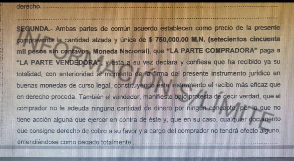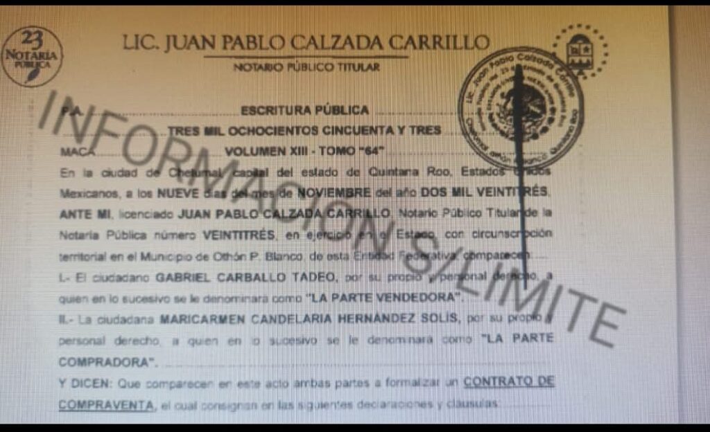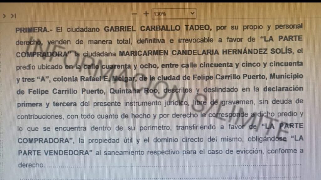 En los documentos del titulo de propiedad registrado ante el Registro Publico de la Propiedad del estado de Quintana Roo y que obran en nuestro poder la pareja de la presidenta de Morena en Quintana roo Mary Hernández el 09 de noviembre de 2023 compro el predio al ex presidente priista de Felipe Carrillo Puerto acusado de desviar recursos, Gabriel Carballo Tadeo ( mejor conocido como Pato Carballo) identificado como lote 001, ubicado en la calle 48, entre 55 y 53 “A” en el municipio de Felipe Carrillo Puerto, ante el notario público No. 23 Juan Pablo Calzada Carrillo en Chetumal, Quintana Roo.