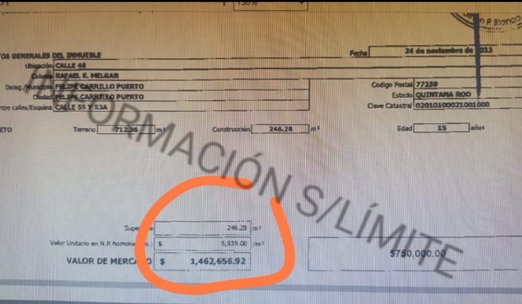 En el avalúo del inmueble que por ley le exigen a los notarios por el Servicio de Administración Tributaria (SAT) para evitar la evasión fiscal o fraude fiscal, el terreno que vendió Pato Carballo a la alcaldesa Morenista Maricarmen Candelaria Hernández Solís estaba evaluado en un MILLÓN 462 MIL 656.92 pesos, pero para evadir al fisco y pagar menos impuestos la transacción la realizaron por el valor de $750 mil pesos.
