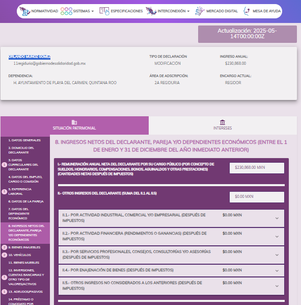 Orlando Muñoz Oculto las ganancias de sus empresas y negocios en su declaración patrimonial desde el 2021 (en el caso de México y bajo la Ley General de Responsabilidades Administrativas) se considera una falta administrativa grave. Al hacerlo, mientes bajo protesta de decir verdad sobre su incremento patrimonial o conflicto de intereses, lo que conlleva consecuencias serias, sin embargo al regidor Orlando Muñoz de Playa del Carmen la valió un sorbete.