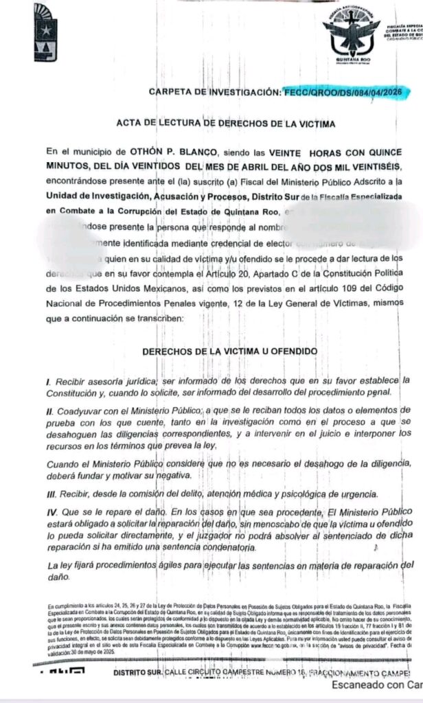 La denuncia quedó identificada como FECC/ QROO/ DS/ 084/ 04/ 2026.