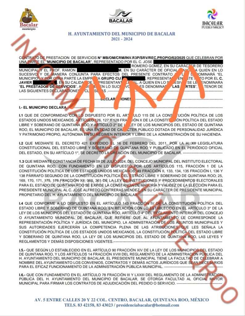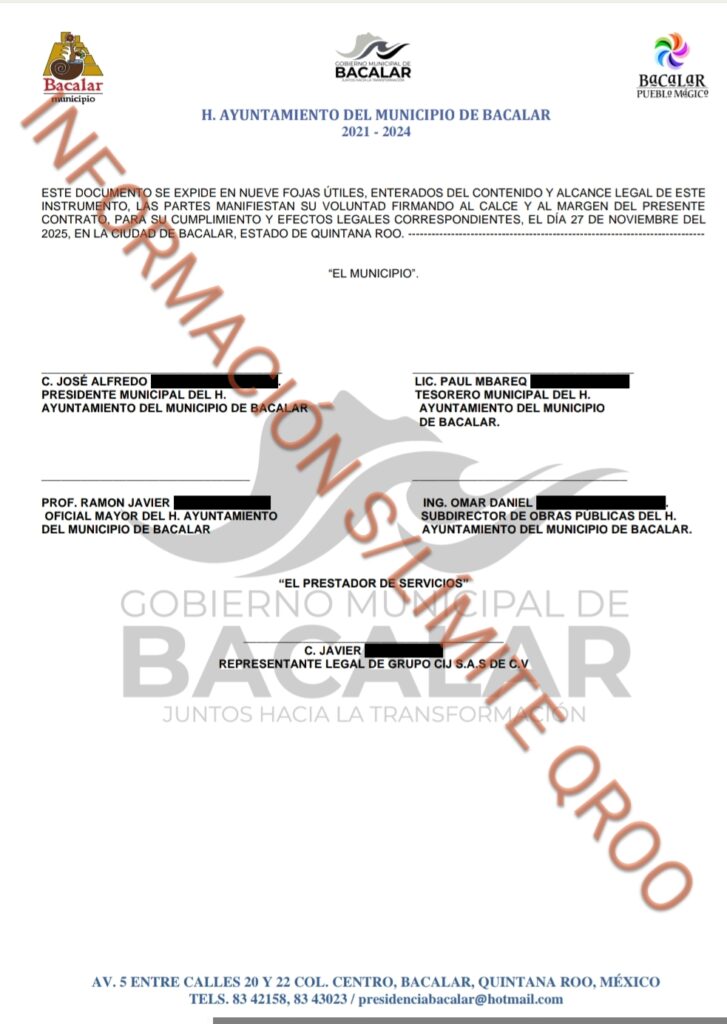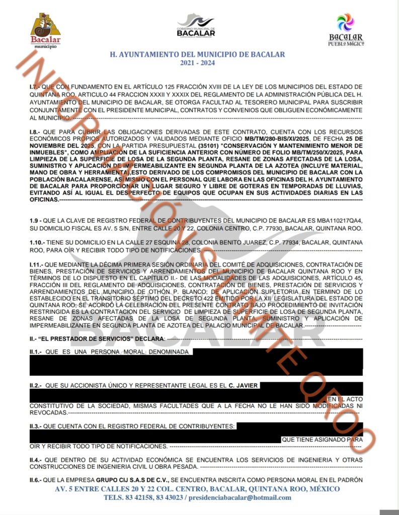 Bajo el numero de contrato MB/OM/CRM/INV.R3P/SRV/REC.PROPIO/02/2025 el alcalde morenista Chepe Contreras le entrego $74546231 pesos a la empresa fantasma GRUPO CIJ S.A. DE C.V para el SERVICIO DE LIMPIEZA DE SUPERFICIE DE LOSA DE SEGUNDA PLANTA Y RESANE DE ZONAS AFECTADAS DE LA LOSA DE SEGUNDA PLANTA DEL PALACIO MUNICIPAL DE BACALAR.