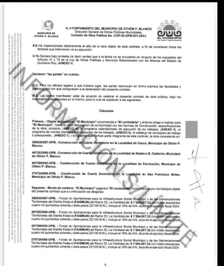 Bajo el número de contrato COP-IO-OPB-031-2024 Yensunni Idalia Martinez en complicidad del tesorero Josué Leonardo Jiménez Herrera y de la directora de obras públicas Ilyanne Jocelyn García Hernández le entregaron $4 millones 818 mil 348 pesos a la empresa “Corporativo FIBROO, S.A de C.V para que de manera insólita construyera más de una docena de cuartos de dormitorios en la comunidad de Cacao, Esteban B Calderón, Revolución y San Francisco Botes.