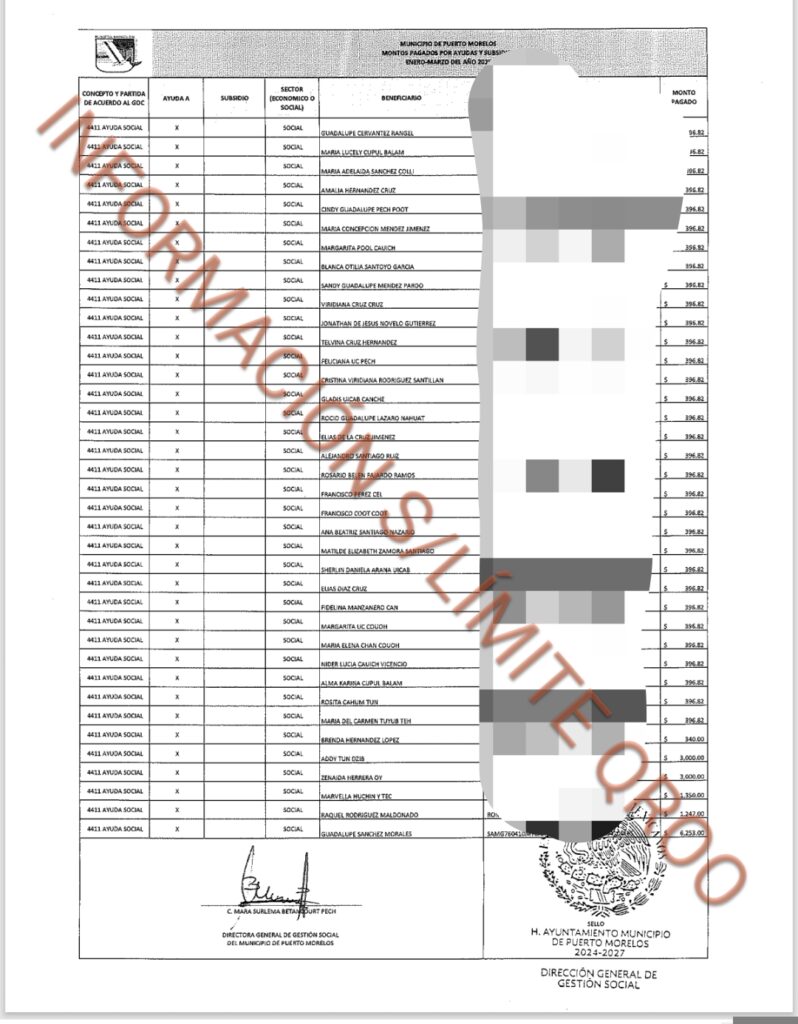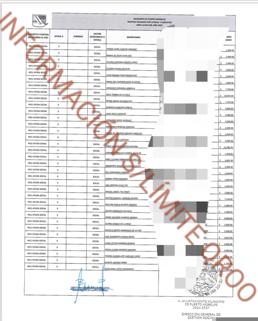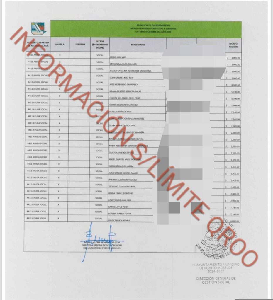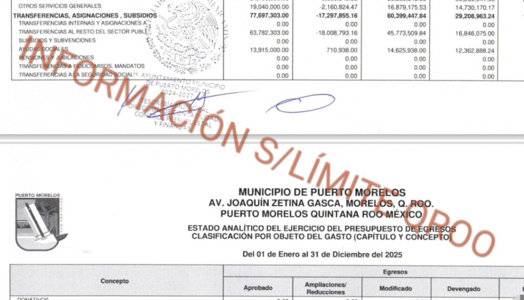 El cabildo de Puerto Morelos le aprobó a Blanca Merari para que reparte a la población mas vulnerable en “Ayuda Sociales” para el ejercicio 2025 una bolsa de $13 millones 915 mil pesos, si embargo Blanca lo aumento a $14 millones 625 mil 938 pesos de acuerdo a los documento contables que obran en nuestro poder del estado analítico del ejercicio del presupuesto de egresos clasificación por objeto del gasto ( capitulo y concepto) del 01 de enero de 2025 al 32 de diciembre de 2025.
