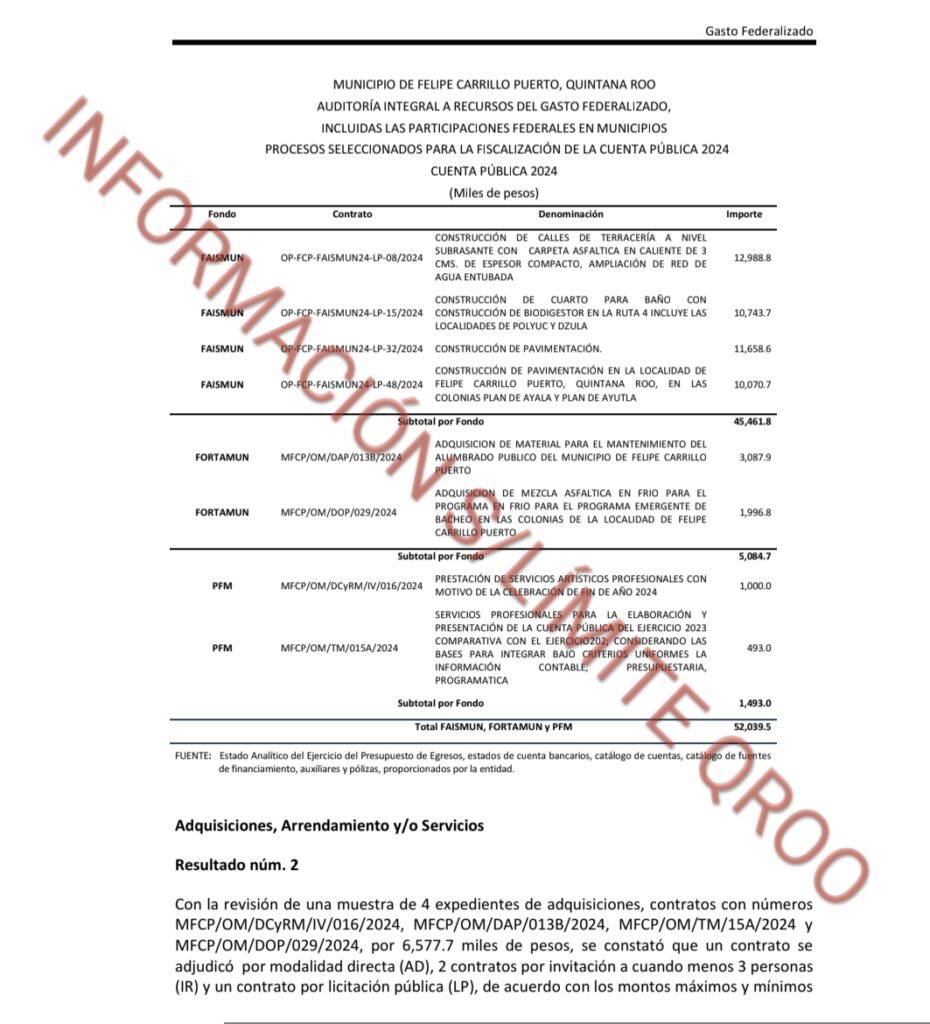 El máximo órgano fiscalizador, la ASF reviso los registros contables y presupuestales del ayuntamiento de Felipe Carrillo Puerto de las erogaciones financiadas con los recursos correspondientes al Fondo de Aportaciones para la Infraestructura Social Municipal (FAISMUN) por 45,461.8 miles de pesos, del Fondo de Aportaciones para el Fortalecimiento de los Municipios y de las Demarcaciones Territoriales del Distrito Federal (FORTAMUN) por 5,084.7 miles de pesos y de las Participaciones Federales a Municipios (PFM) por 1,493.0 miles de pesos; para un totalde 52,039.6 miles de pesos.