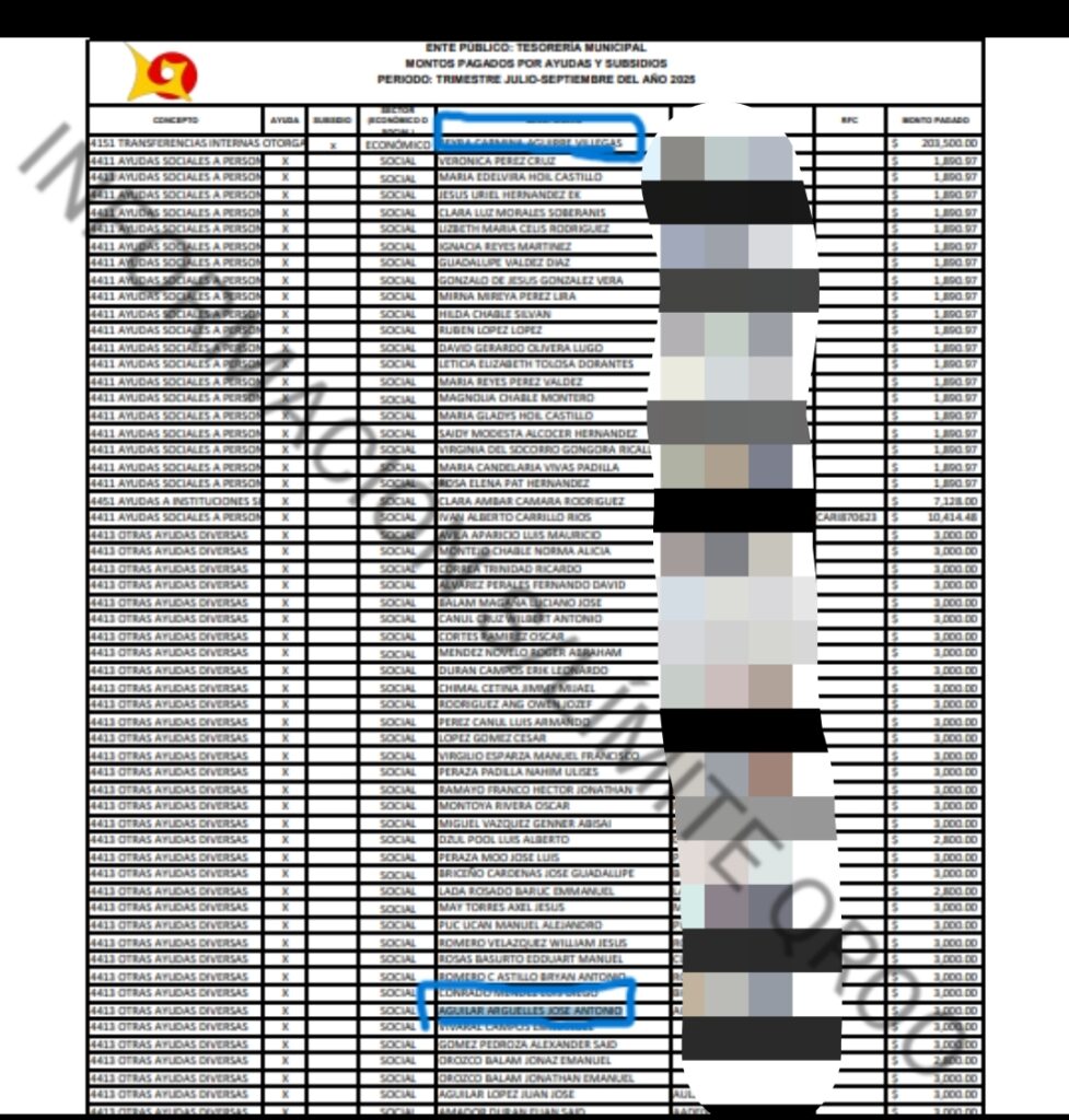 En los documentos que obran en nuestro poder, se muestra como funcionarios públicos entramaron un esquema para el saqueo de recursos mediante las “Ayuda Sociales” y donde malversaron recursos beneficiando a gente no vulnerable, entre los documentos destacan varias personas que se beneficiaron ampliamente de estos programas, La directora del DIF Municipal de Othón P. Blanco (OPB) Beyra Aguirre Villegas, el director del portal del Facebook La Voz del Pueblo Chetumal. Aguilar Arguelles José Antonio dueño en Chetumalisimos y el Secretario General de la Sección 25 del SNTE Quintana Roo, José Arimael Salas Alcocer.