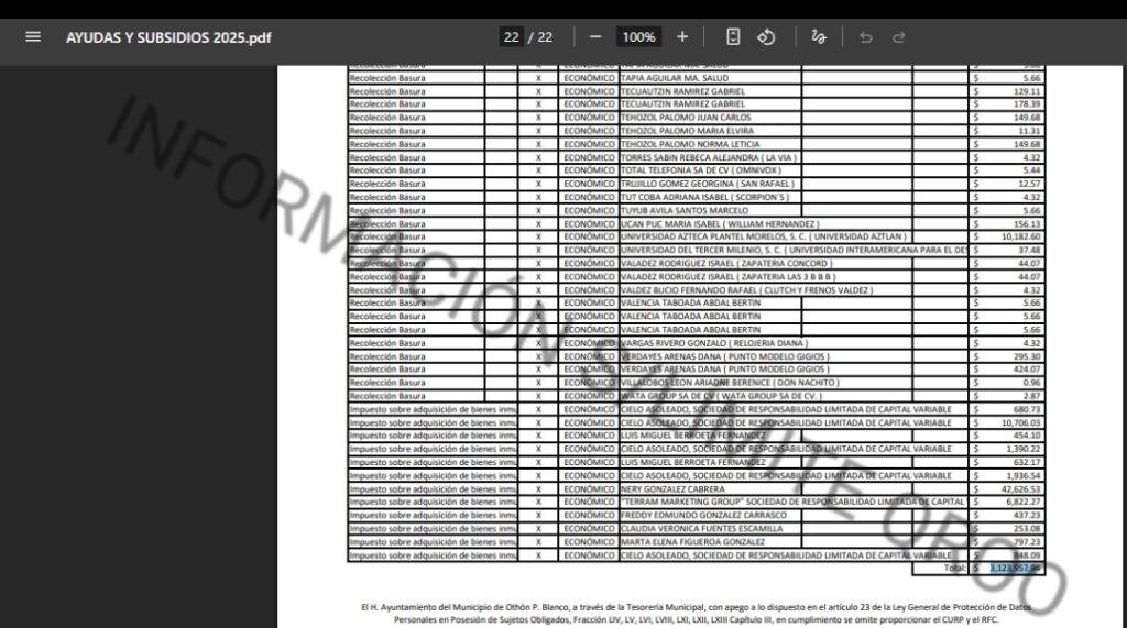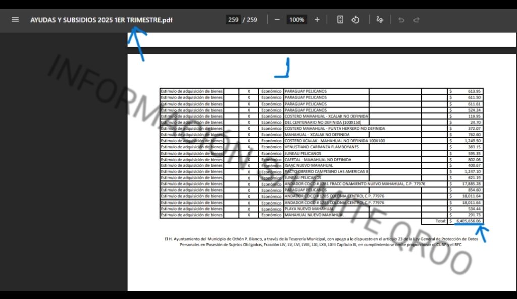 En las Auditorias Federales que se le esta realizando al ayuntamiento de OPB en este 2025 (internas), en una revisión de los estados financieros reportados a la federación (gastos) y los documentos de las “Ayudas Sociales” entregadas apegándose a las NORMAS PARA ESTABLECER LA ESTRUCTURA DE LA INFORMACIÓN DE MONTOS PAGADOS POR AYUDAS Y SUBSIDIOS FEDERALES, revela el presunto QUEBRANTO FINANCIERO DE $7 MILLONES 732 MIL 500 PESOS, QUE NUNCA LLEGO PARA APOYAR A LA POBLACIÓN MAS VULNERABLE DEL AYUNTAMIENTO DE OTHÓN P BLANCO.
