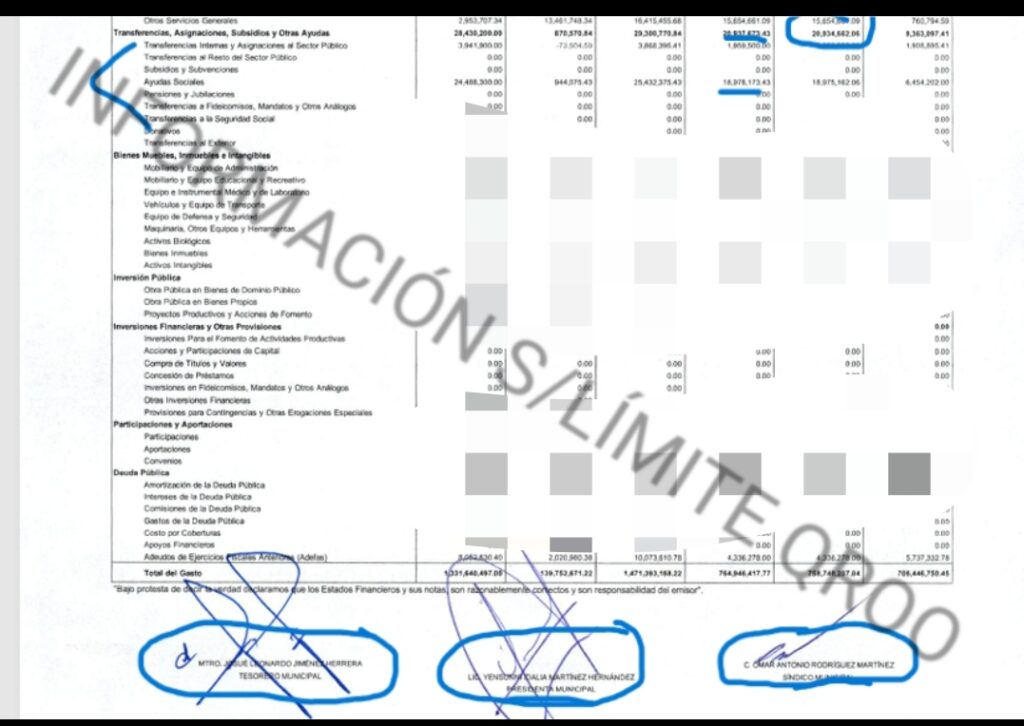 Para tapar esos tremendos desfalcos financieros, la alcaldesa Yensunni Martínez en contubernio del tesorero Leonardo Jiménez Herrera y avalado por el sindico Omar Antonios Rodríguez Martínez revolvieron la documentación de los MONTOS PAGADOS POR AYUDAS SOCIALES CON LOS DE SUBSIDIOS.