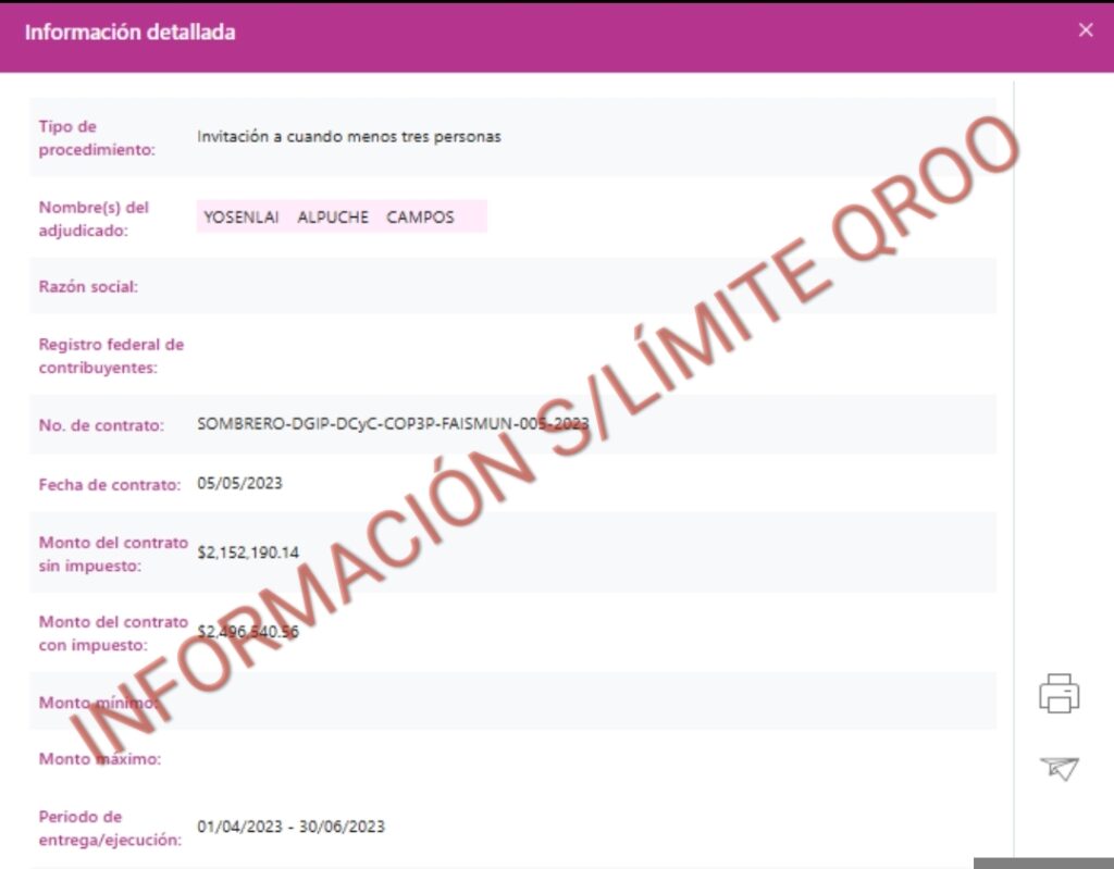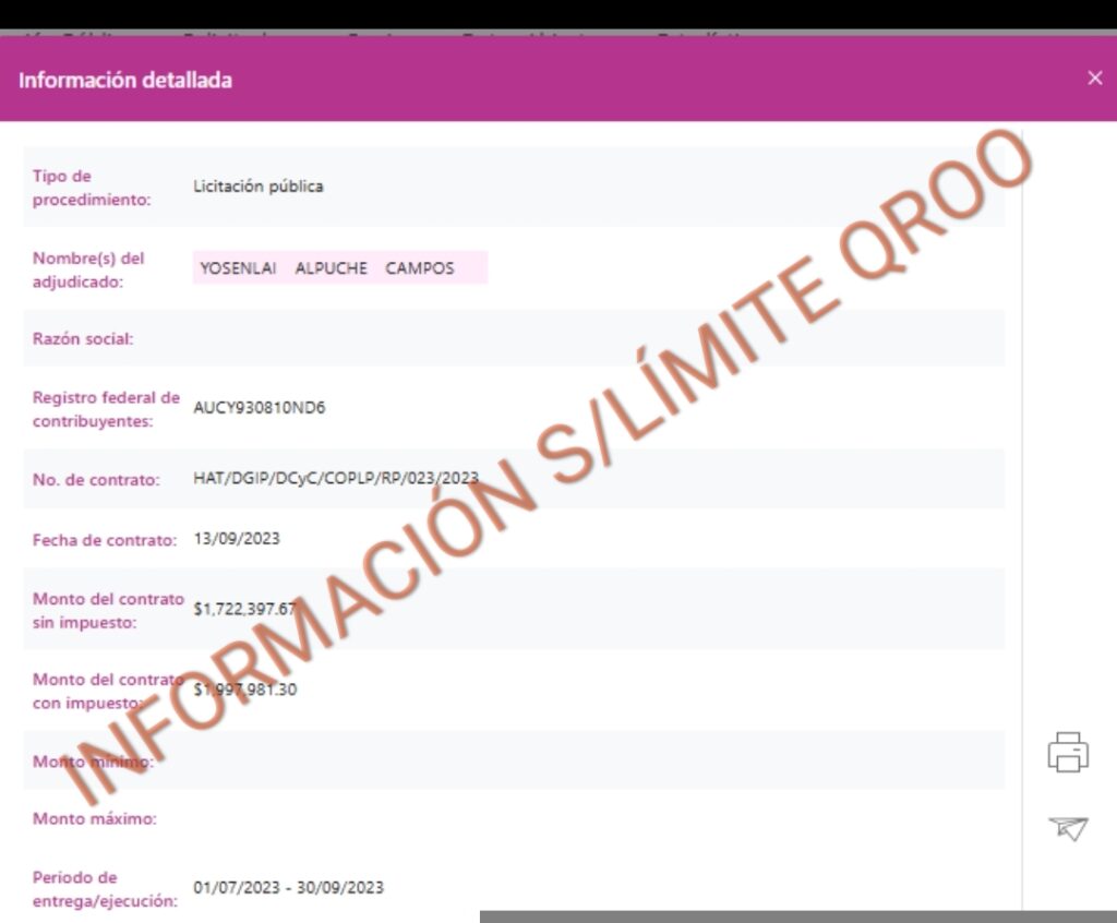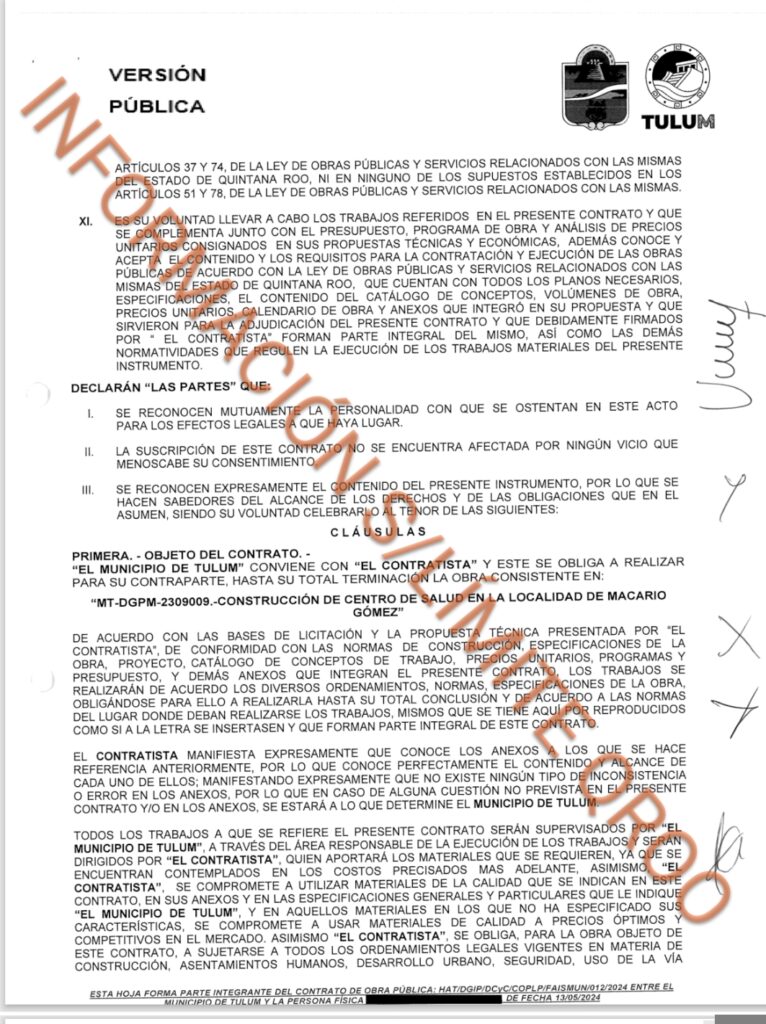 En todos los contratos que entrego el ayuntamiento de Tulum ocultaron con tinta negra el nombre de Yosenlai Alpuche Campos y sus firmas.