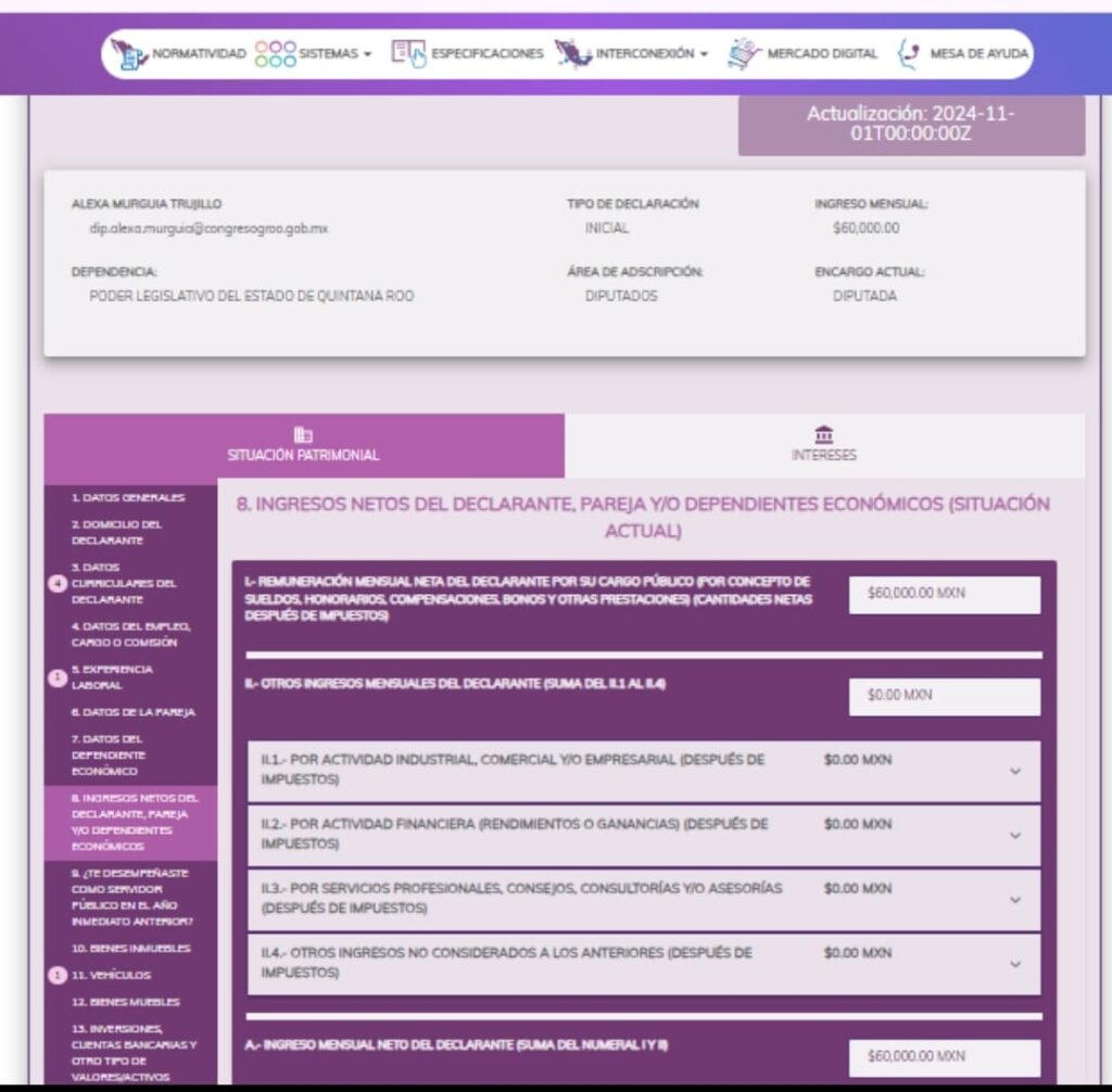 Sin embargo la diputada del verde hace todo lo contrario burlándose de la Ley General de Responsabilidades Administrativas, ya que en su declaración patrimonial 2024 declara que tubo ingresos anuales por $360 mil pesos en total por la remuneración mensual por su cargo publico por concepto de sueldo, honorarios, compensaciones y bonos según su declaración patrimonial que ella misma emite a través de la plataforma digital anticorrupción.
