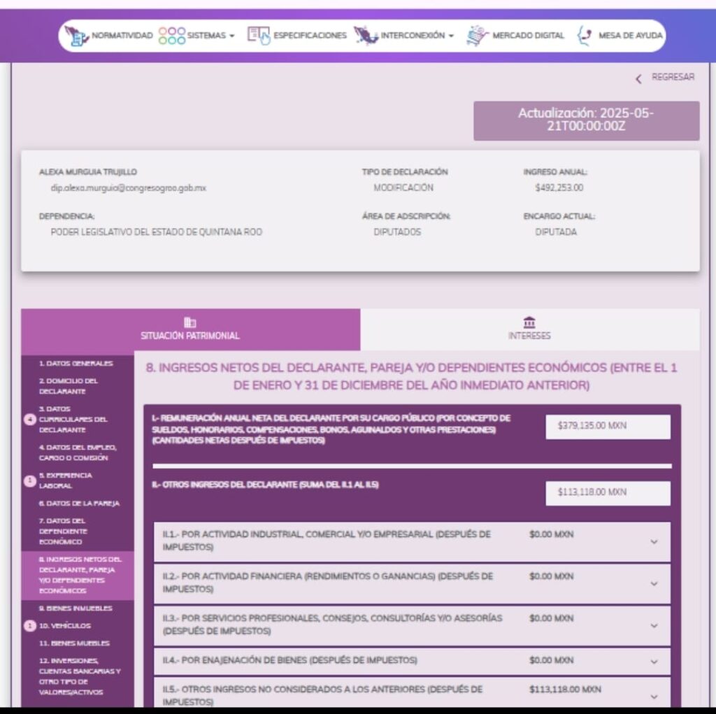 Para el 2025 declaró que ganó al mes la comadre del “Pillo Verde” Renán Tajonar, ya que gracias a el llego como diputada del PVEM $18 mil 956.75 al mes, un total hasta el día 30 de mayo de 2025 por $379 mil 135 pesos.