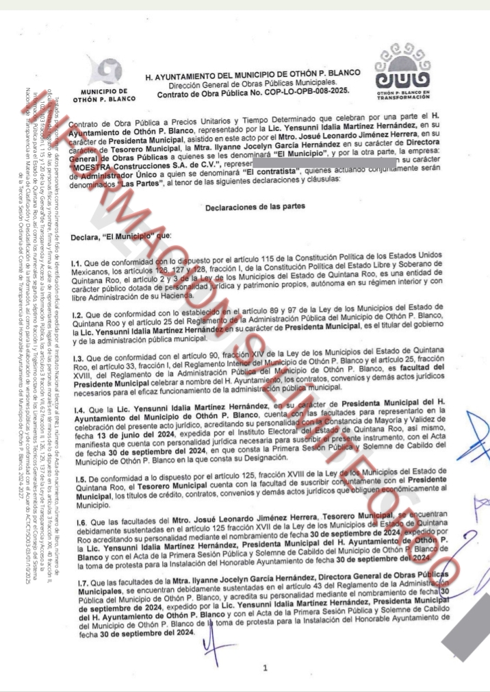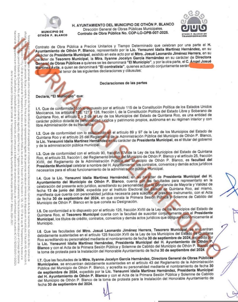 La alcaldesa morenista Yensunni Martínez le entrego varios contratos de obras publicas en esta administración (2024-2027) con el aval y complicidad del tesorero Josué Leonardo Jiménez Herrera y del secretario de obras públicas Ilyanne Jocelyn García Hernández por un monto total de $16 millones 980 mil 708 pesos a Ángel Josué Martínez Ávila AUDITOR EN MATERIA DE OBRA PÚBLICA de la Auditoria Superior del estado (ASEQROO) bajo el mando del ex tesorero de Othón P Blanco Miguel Zogby Cheluja Martínez.