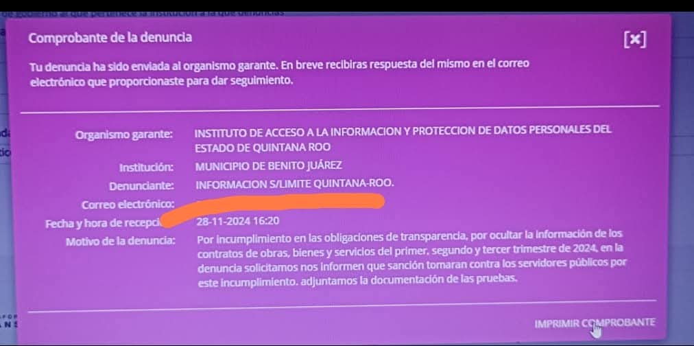 En noviembre del 2024 nuestro portal Información S/Límite Quintana Roo denuncio la administración de la alcaldesa morenista Ana Patricia Peralta de la Peña del municipio de Benito Juárez ante el Instituto Nacional de Transparencia (Federal) por el incumplimiento en las obligaciones de transparencia, ESPECIFICAMENTE por ocultar la información de los contratos de obras, bienes y servicios del primer, segundo y tercer trimestre de 2024 por un monto de mas de $500 millones de pesos, entregando todas las pruebas correspondientes de la misma plataforma nacional de transparencia.