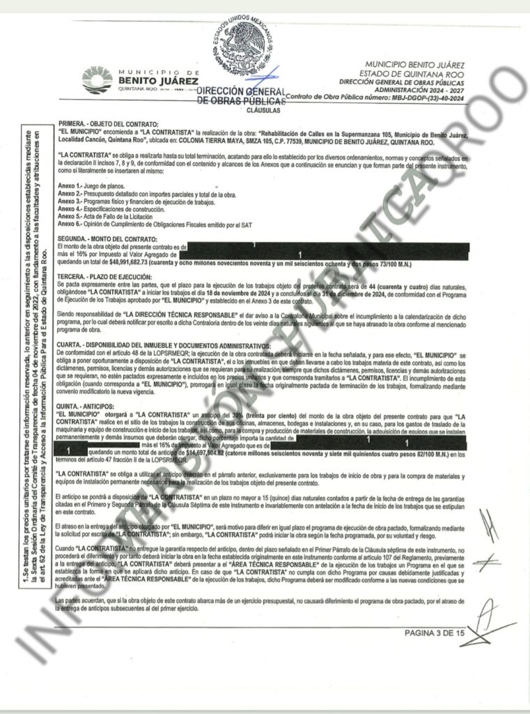 El primer contrato que le entregaron a la empresa ASFALTO DEL CARIBE, S.A. DE C.V fue bajo el numero de contrato MBJ-DGOP-LPN-823005999-FAISMUN-056-2024 por $48 millones 991 mil 682.73 pesos para la Rehabilitación de Calles en la Supermanzana 105, Municipio de Benito Juárez, Localidad Cancún, Quintana Roo en su primera etapa, a esta obra ya le inyecto el ayuntamiento mas de $100 millones de pesos .