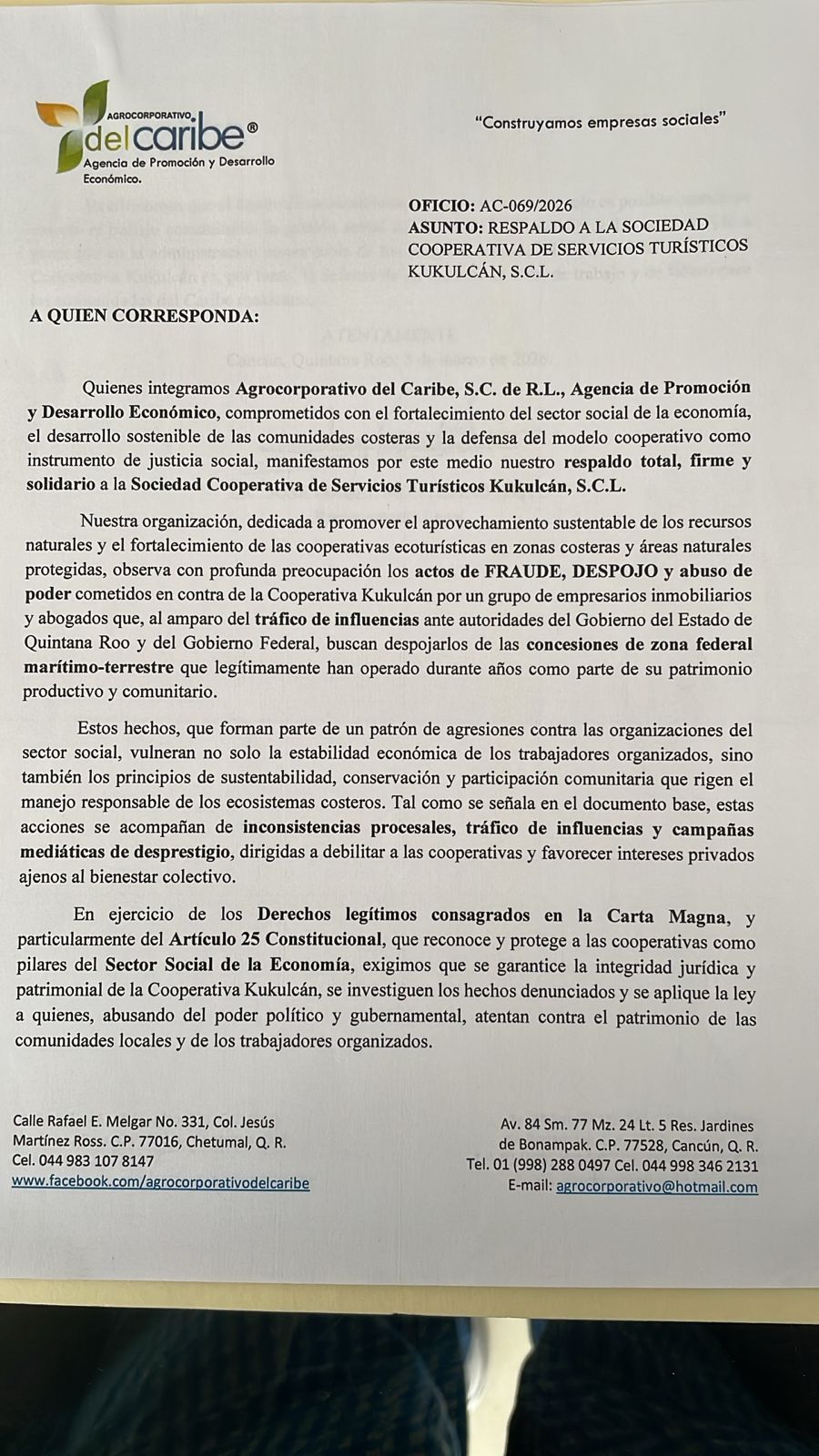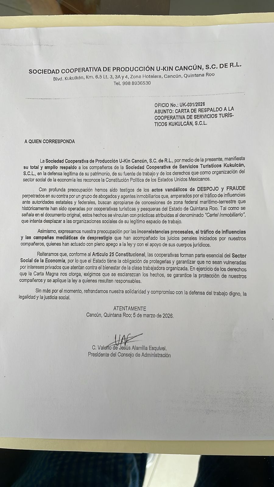 Este martes 10 de marzo, integrantes de la directiva de la Sociedad Cooperativa de Servicios Turísticos Kukulcán, acompañados por su abogado, se trasladaron hasta la comunidad maya de X-Pichil, en el municipio de Felipe Carrillo Puerto, donde la gobernadora Mara Lezama Espinoza encabezó una audiencia pública, pero no fueron recibidos por la titular del Poder Ejecutivo Estatal debido a que sus colaboradores se negaron a incluirlos en la agenda.