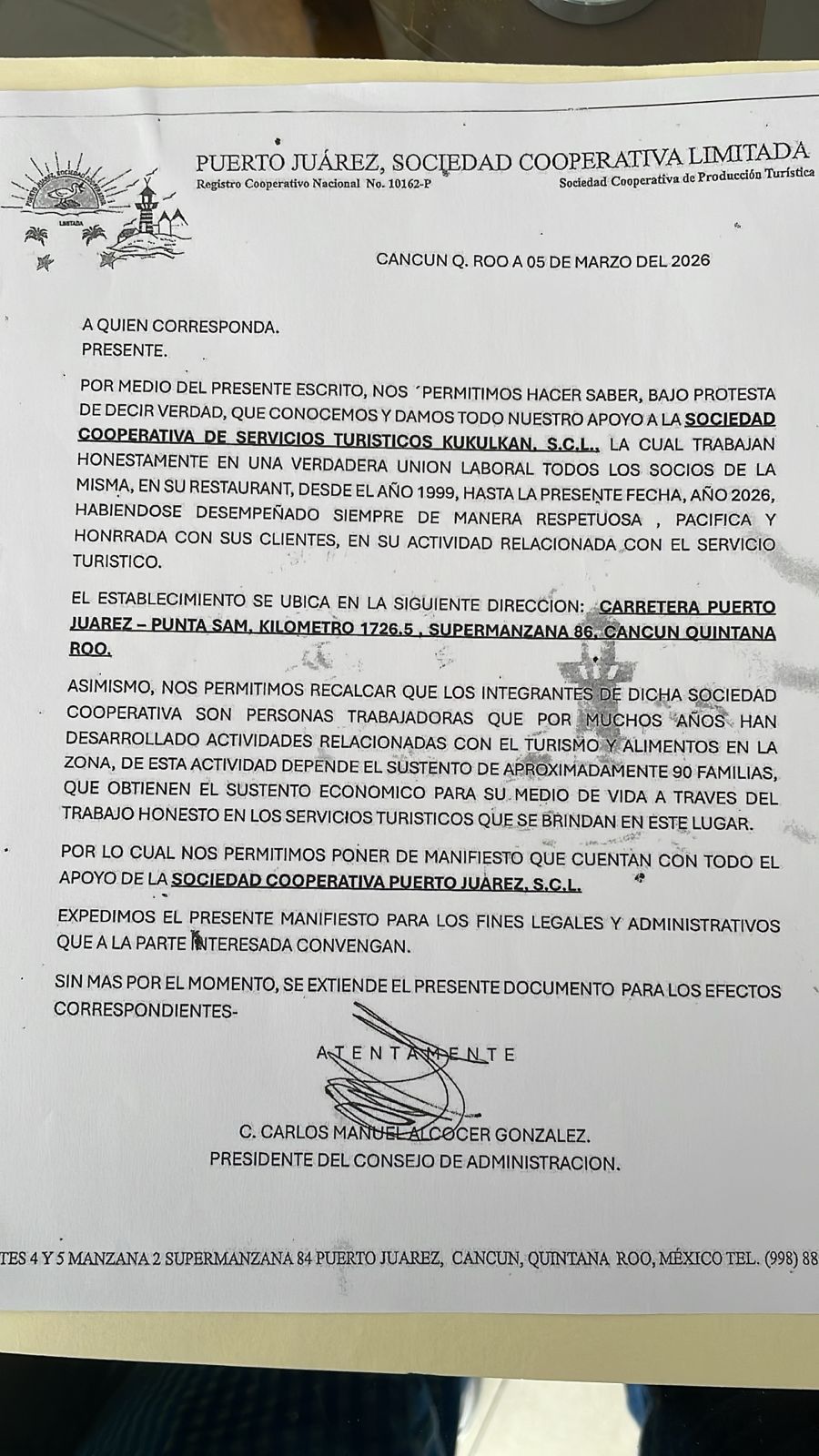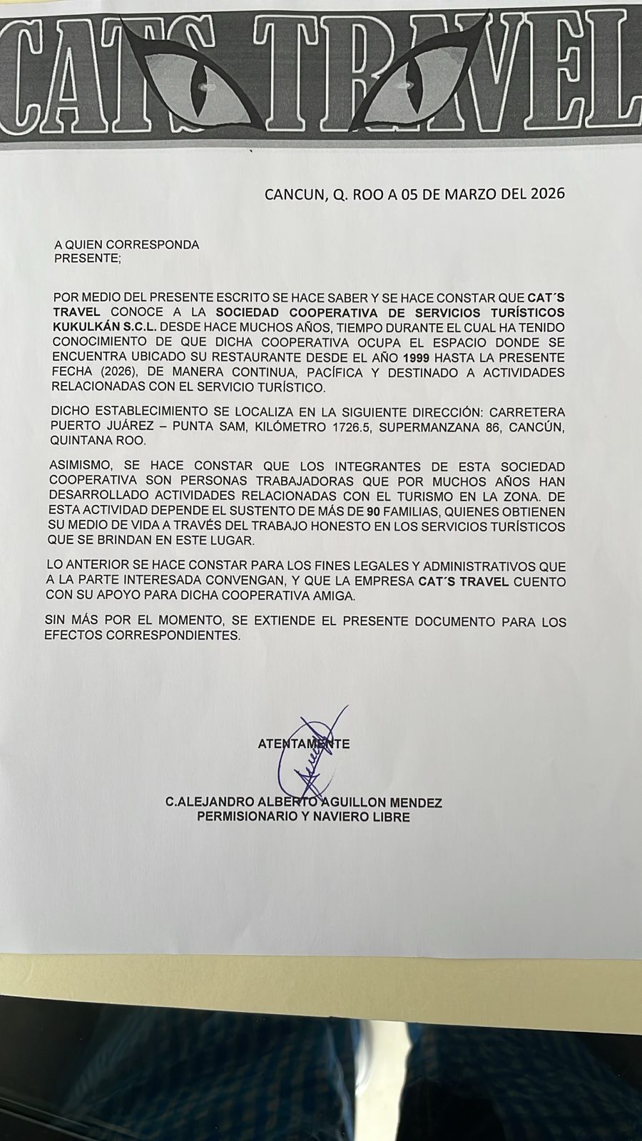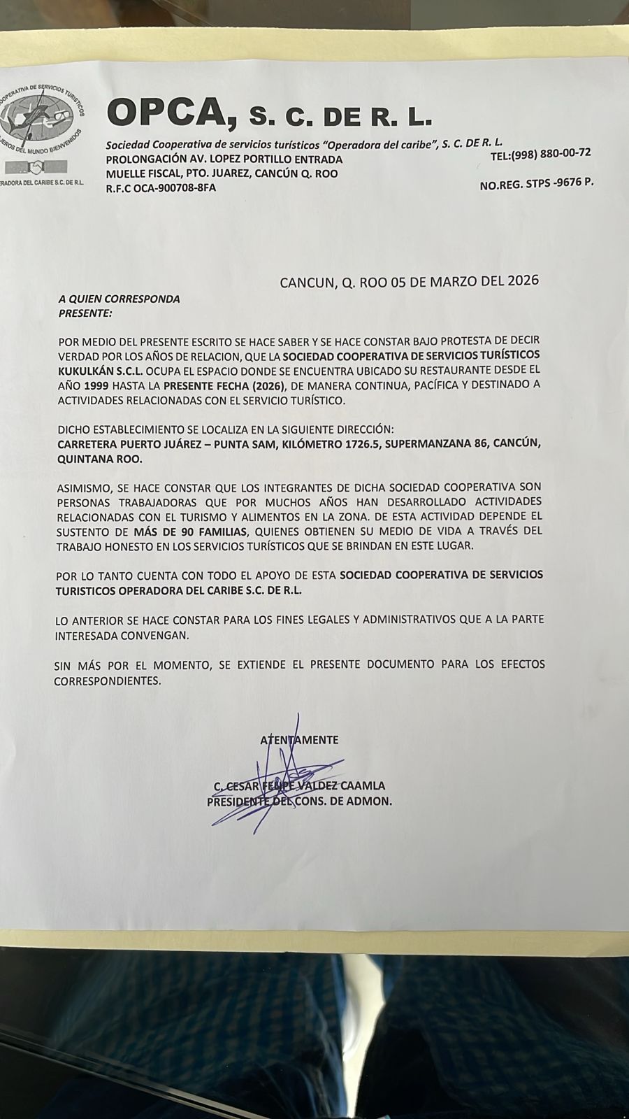 A pesar de ello, uno de los cooperativistas logró acercarse y entregó en mano a Mara Lezama un documento en el que se le vuelven a plantear sus demandas para que intervenga y se evite que la familia de la presidenta municipal de Cancún les arrebate el uso de la concesión que ha servido para tener empleos y sostener económicamente a sus familias.