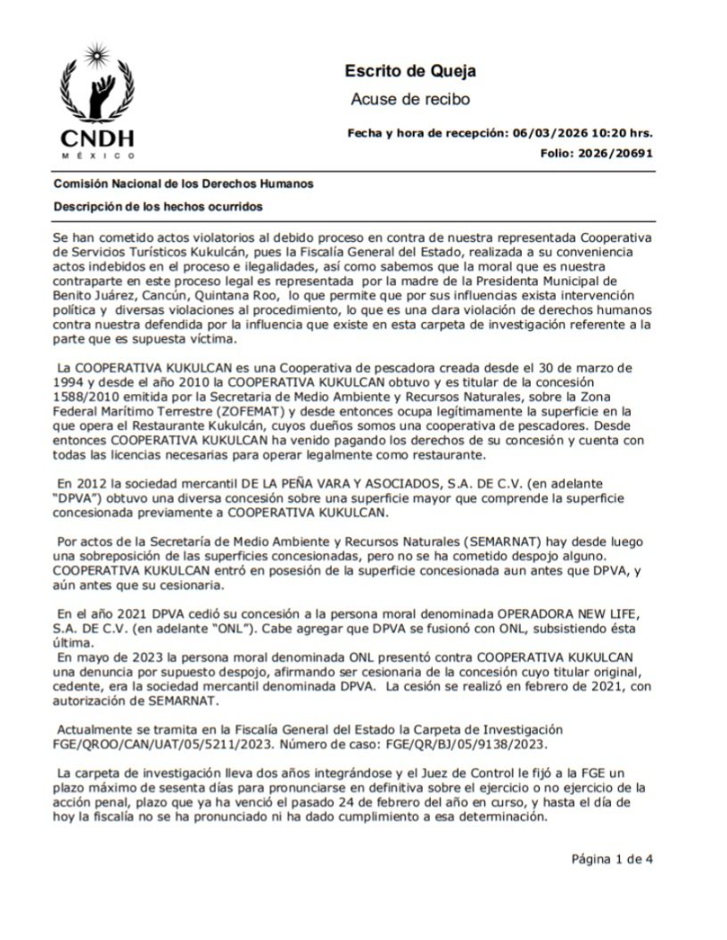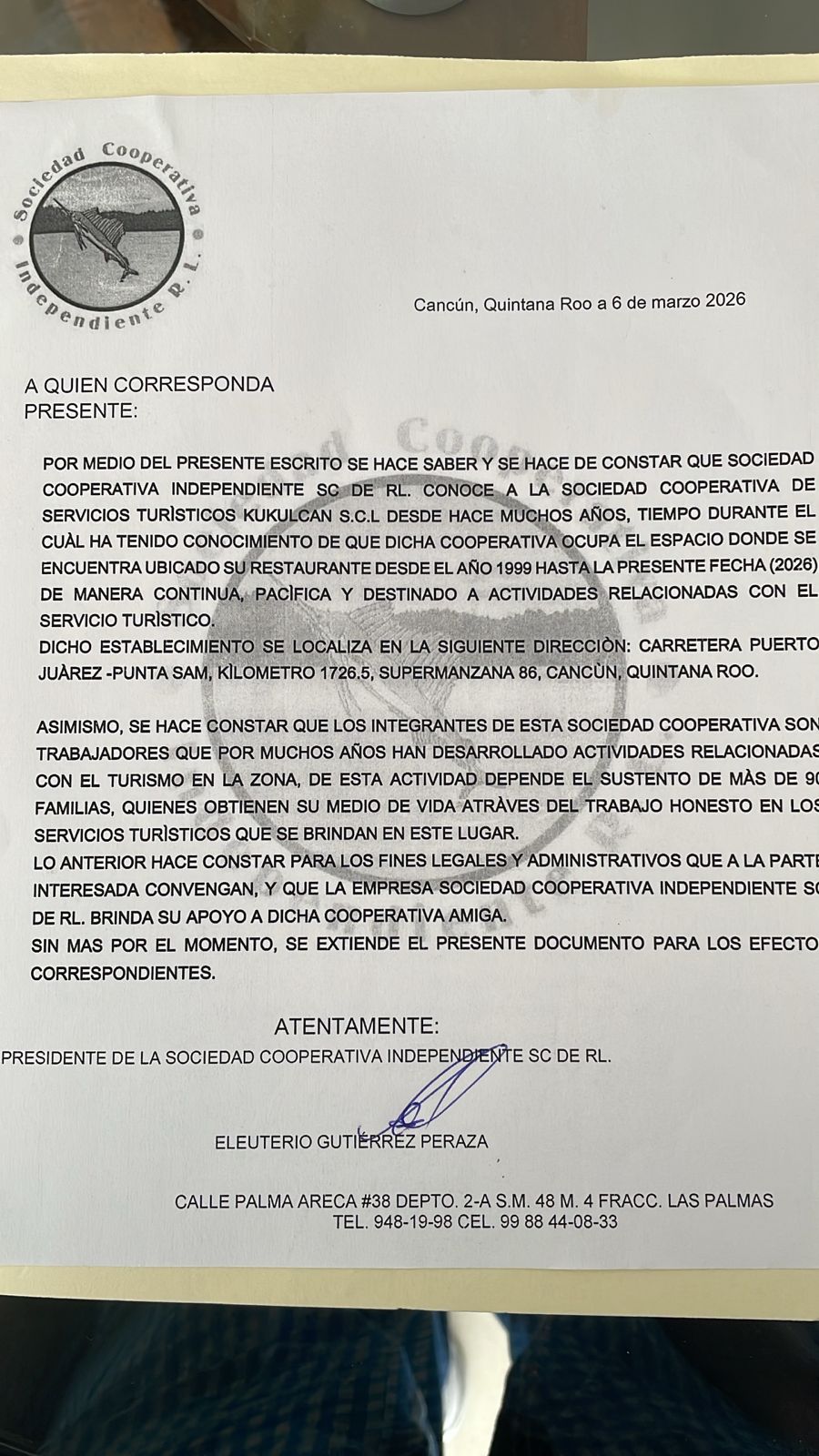 Recordemos, que hace unas semanas, representantes de la cooperativa, solicitaron el apoyo de la gobernadora Mara Lezama Espinoza, para que los ayudara a defender el patrimonio que les sirve para mantener a sus familias ante las acciones ilegales de despojo, como que una juez del Poder Judicial Estatal determinó asegurar el predio donde opera el restaurante, a petición de las empresas de la cual es apoderada Ana Patricia de la Peña Sánchez, madre de la presidenta municipal de Cancún e hija de Diego de la Peña, quien en vida decidió que los predios concesionados a los pescadores deberían estar siendo usufructuados por él y por su familia.