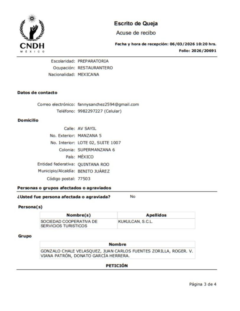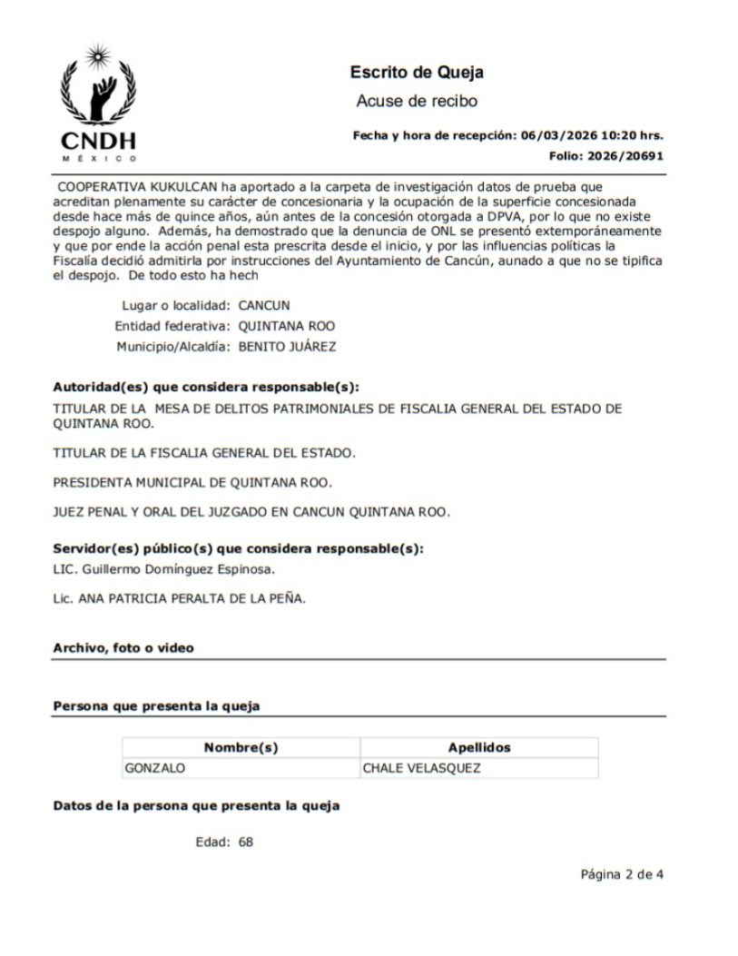 En estas quejas ante la CNDH y la CDHQR fueron señaladas como autoridades responsables: El titular de la Mesa de Delitos Patrimoniales de la Fiscalía General del Estado de Quintana Roo, Guillermo Domínguez Espinoza; el titular de la Fiscalía General del Estado de Quintana Roo, Raciel López Salazar; la presidenta municipal de Benito Juárez (Cancún), Ana Patricia Peralta De la Peña, así como el Juzgado Penal de Control en Cancún Quintana Roo.