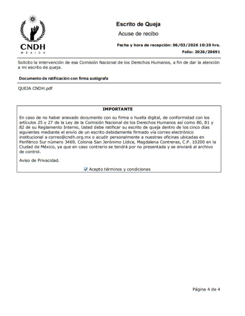 En este contexto, dieron a conocer que ya presentaron sendas quejas formales ante la Comisión Nacional de Derechos Humanos (CNDH) y la Comisón Estatal de Derchos Humanos por lo que consideran irregularidades en el respeto a sus derechos humanos que han cometido tanto dependencias federales como estatales.