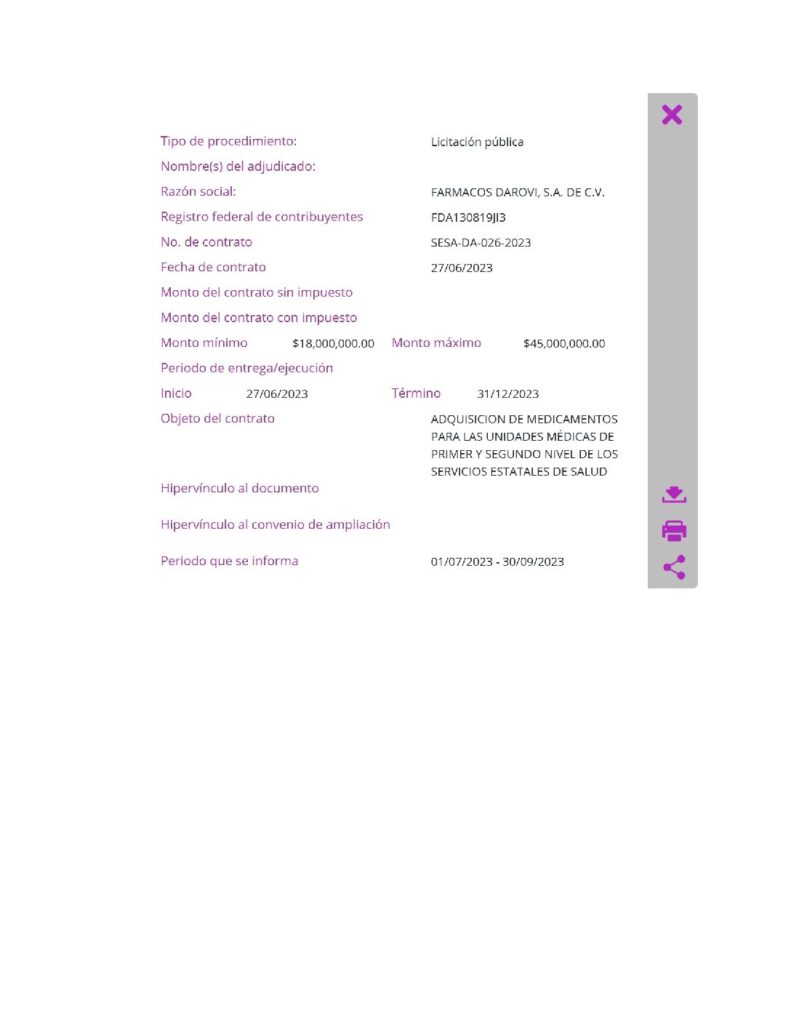 Bajo el numero de contrato SESA-DA-SRM-V-001-2024 le entregaron el 13 de mayo de 2024 a Darovi $40 millones de pesos para la adquisición de medicamentos, algunos de los medicamento fueron pagados a sobre precio es por eso que el SESA oculto los contratos.
