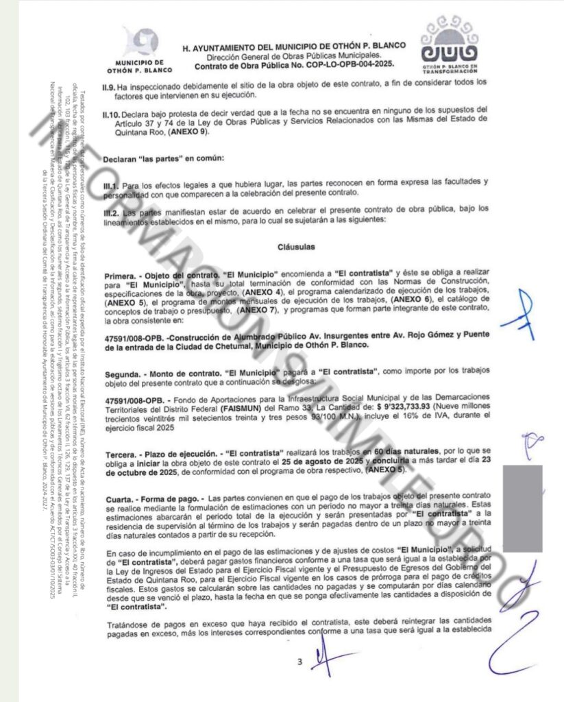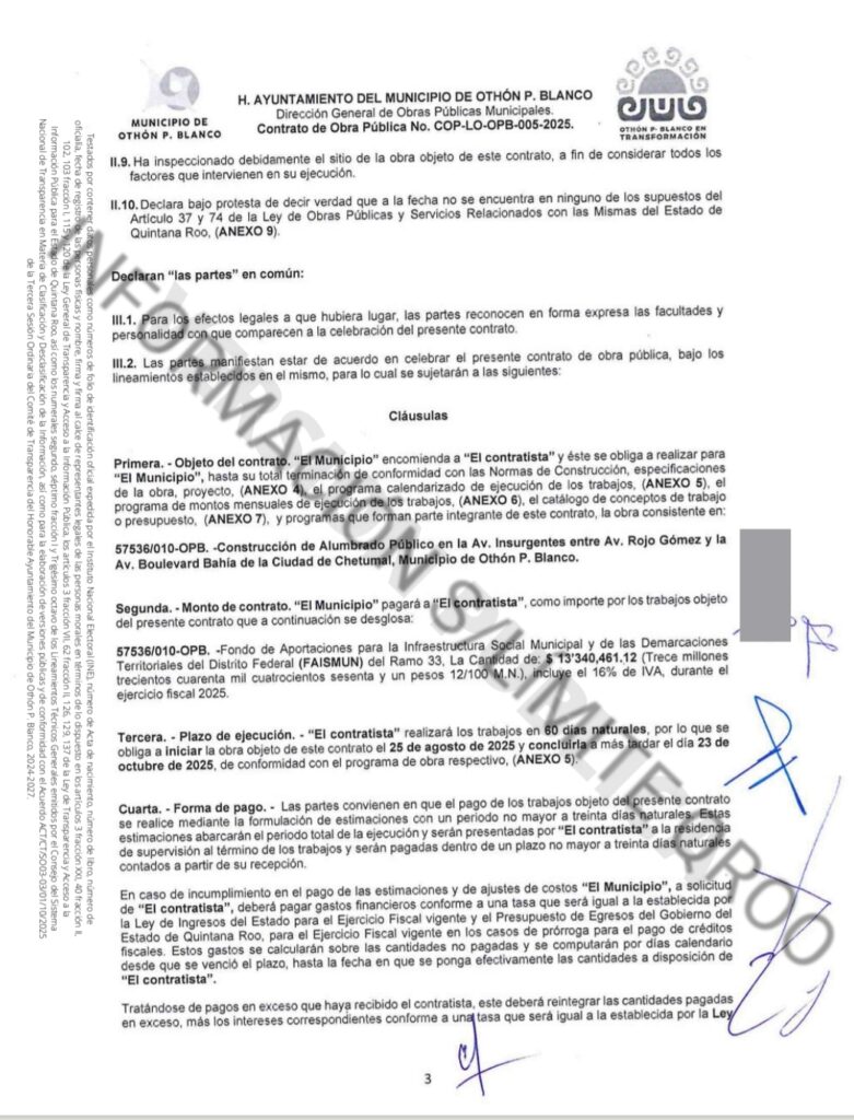 El segundo contrato que recibió ORDAR fue bajo el numero de contrato COP-LO-OPB-005-2025 por $9 millones 323 mil 733.93 pesos para la construcción de alumbrado público Av. Insurgentes entre Av. Rojo Gómez y Puente de la entrada a Chetumal.