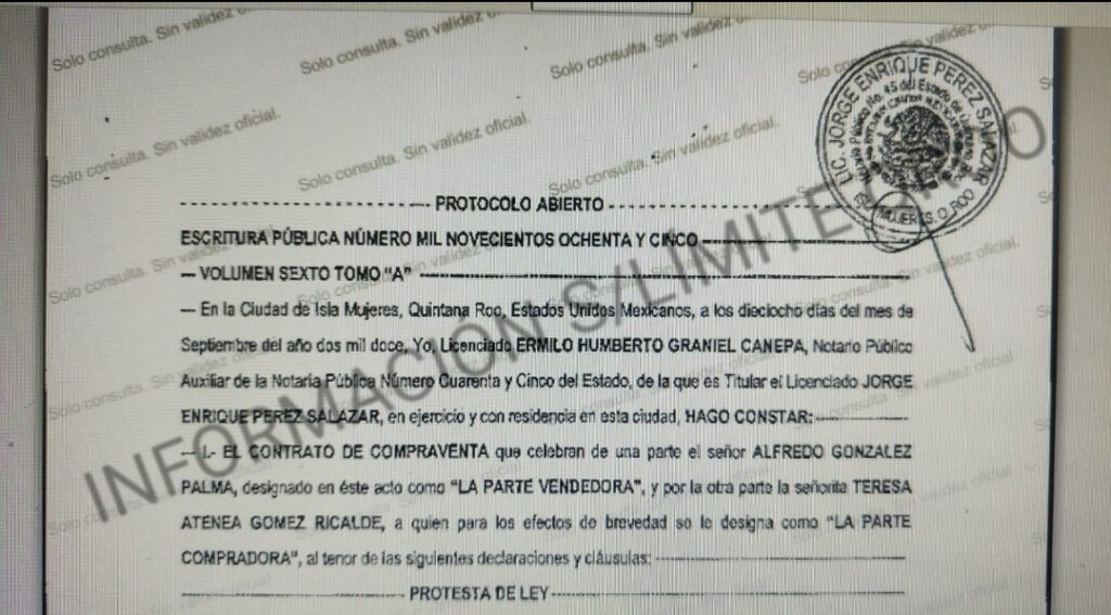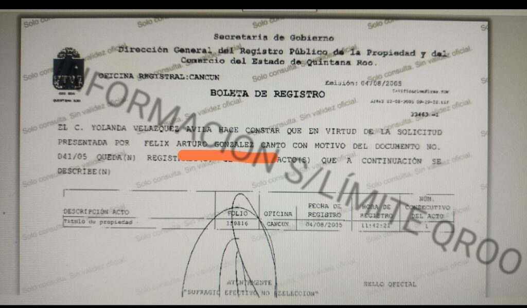 El segundo predio que oculto en su declaración patrimonial fue la adquirida en Isla Mujeres, cita solicitud fue presentada por nada más y nada menos que por Félix Arturo González Canto ex gobernador priista de Quintana Roo.