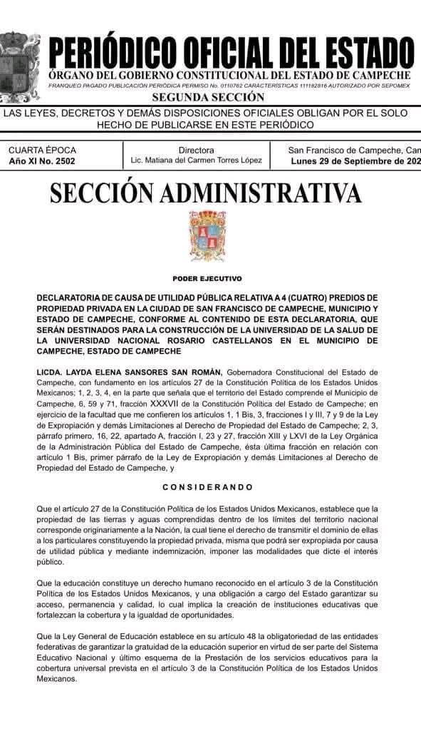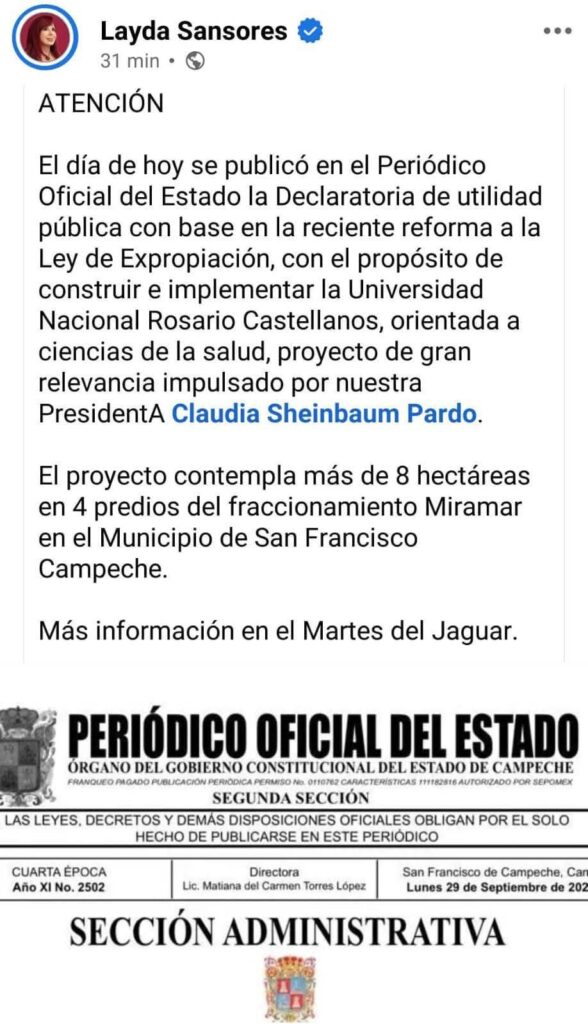 En una muestra de que la reforma a la Ley de Expropiaciones sí tenia dedicatoria especial, el Ejecutivo Estatal emitió su primer decreto para expropiar las primeras 8 hectáreas de propiedad privada como de utilidad pública, en el fraccionamiento Miramar, para construir la Universidad “Rosario Castellanos”, pero no aclaró que los predios son propiedad de personas cercanas al dirigente nacional del PRI, Alito Moreno, entre ellas su madre.