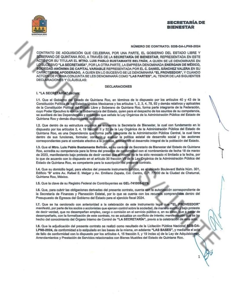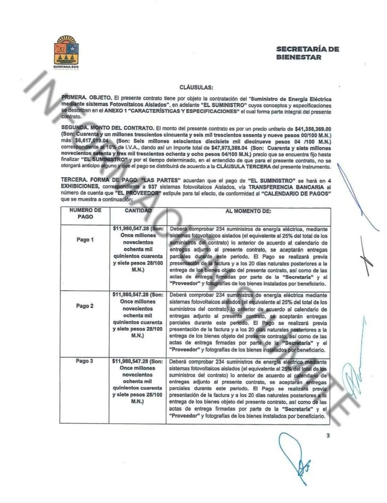 Bajo el número de contrato SDB-DA-LPN8-2024 por medio de Luis Pablo Bustamante se le entregó $47 millones 973 mil 388.04 pesos a la empresa poblana ENERGAIN DE MÉXICO SA de CV para proporcionar energía eléctrica a través de paneles solares a 937 viviendas en los municipios de Othón P Blanco, Bacalar, Felipe Carrillo Puerto, Playa del Carmen, Benito Juárez y Lázaro Cárdenas pero a precio de oro.