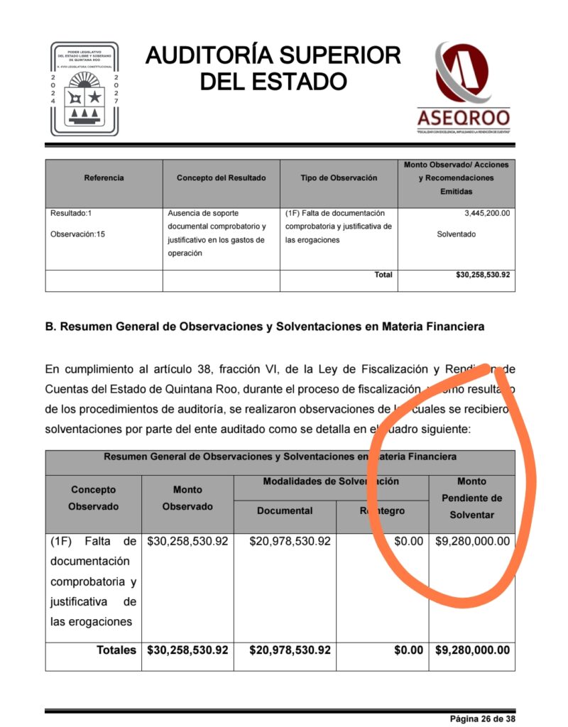 Sin embargo la ASF le detecto un quebranto financiero por mas de $281 millones de pesos comparado con la auditoria estatal, a pesar que ya pasaron los 90 días que marca la ley para su solvencia y devolución, la ASEQROO sigue protegiendo la corrupción de la acaldesa de Morena pisoteando las leyes en total complacencia de los diputado de las XVIII Legislatura de Quintana Roo.