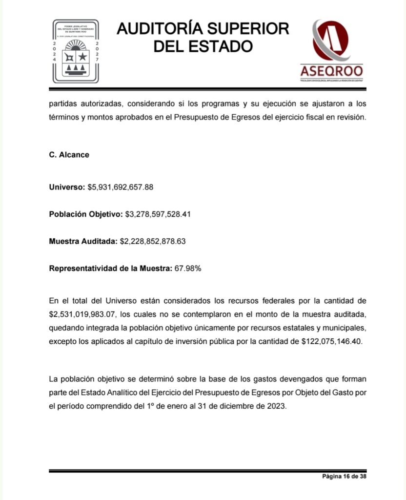EN LOS GASTOS PUBLICOS DEL AYUNTAMIENTO DE BENITO JUAREZ EN EL EJERCICIO FISCAL 2023, LA ASEQROO AL FRENTE DE CHELUJA SOLO LE AUDITO DOS MIL 228 MILLONES DE PESOS DE LOS MAS DE CINCO MIL 931 MILLONES DE PESOS QUE GASTO LA ADMINISTRACIÓN DE ANA PATY PERLATA.