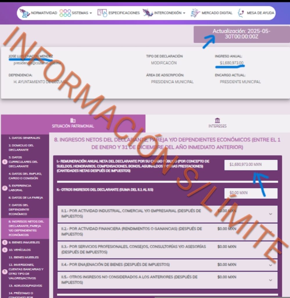 De acuerdo Sistema de evolución patrimonial, de declaración de intereses y constancia de presentación de declaración fiscal del 2025 presentado por el mismo presidente municipal de Cozumel José Luis Chacón Méndez en su primer año como alcalde logro obtener ganancias solo en su salario, $1 millón 680 mil 973 pesos libre de impuestos.
