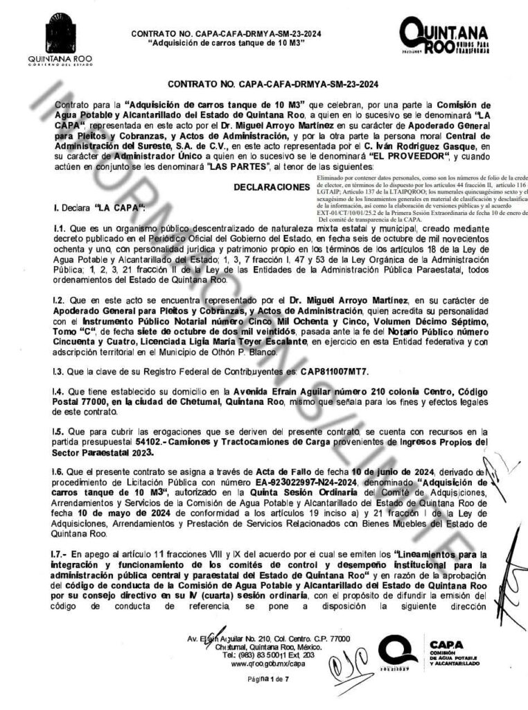 Está compra que simuló capa pagando $11 millones 894 mil 528.39 por tres camiones pipa de agua al ex director de la CANACO fue mediante su empresa Central de Administración del Sureste S.A de C.V con número de contrato CAPA-CAFA-DRMYA- SM -23-2024.