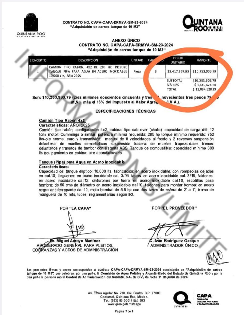 Cada camión tipo Rabón de 4×2, con tanque Pipa para agua en acero inoxidable de 10 mil litros modelo 2025 cuesta aproximadamente 2 millones de pesos, sin embargo la Comisión de Agua Potable y Alcantarillado (Capaqroo) adquirió cada pipa de las mismas características por $3 millones 949 mil 842.80 pesos aprovechándose del desabasto de agua potable en la capital Chetumal.