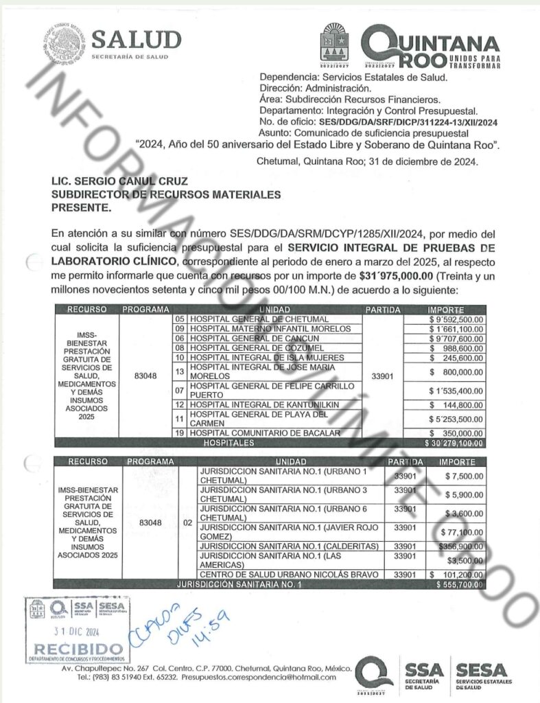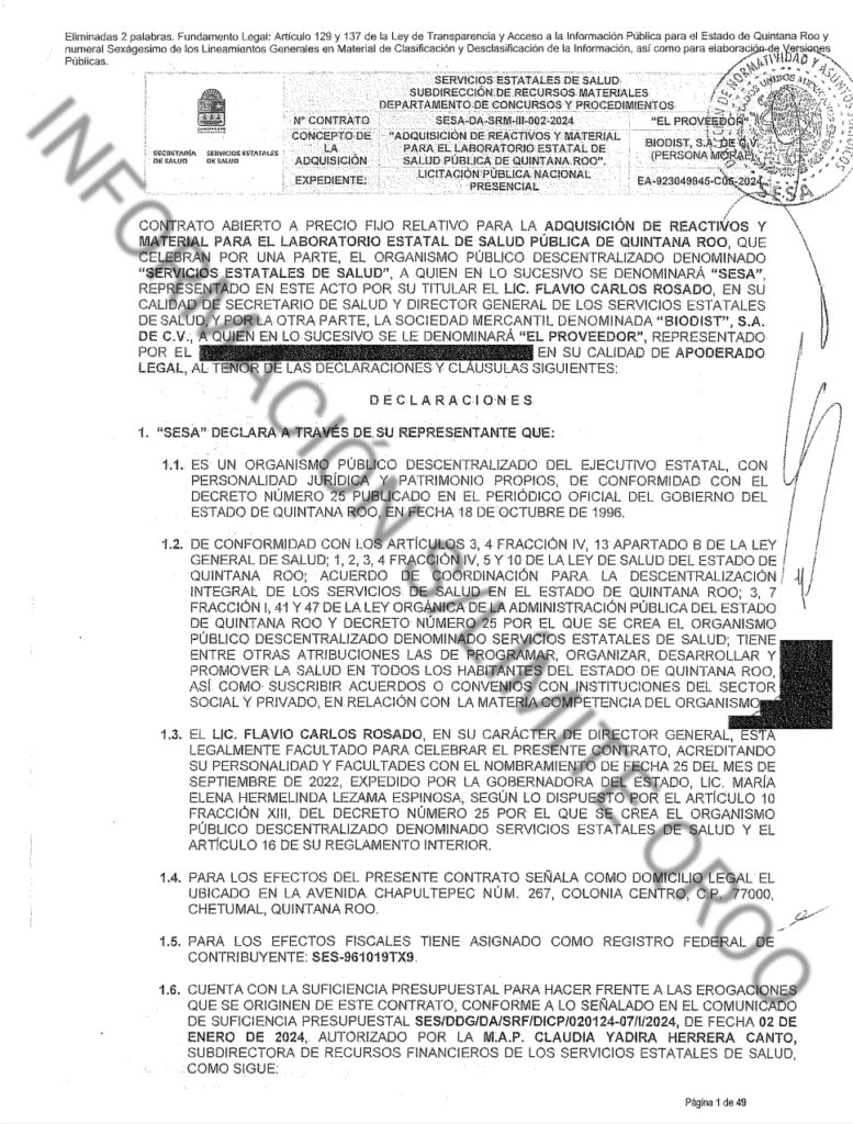 En Quintana Roo los contratos fueron firmados por el secretario de salud Flavio Carlos Rosado y Sergio Canúl Cruz como subdirector de recursos materiales con recursos propios, en Veracruz los contratos fueron pagados con recursos federales del IMSS Bienestar firmados por el secretario de Salud de Veracruz, Valentín Herrera Alarcón, así como por David Jahziel Pérez, subdirector de Recursos Materiales.