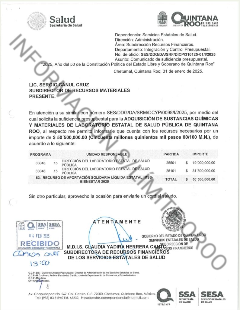 SESA-DA-SRM-III-002-2025 PARA LA ADQUISICIÓN DE SUSTANCIAS QUÍMICAS Y MATERIALES DE LABORATORIO ESTATAL DE SALUD PÚBLICA DE QUINTANA ROO POR $50500000 PESOS.
